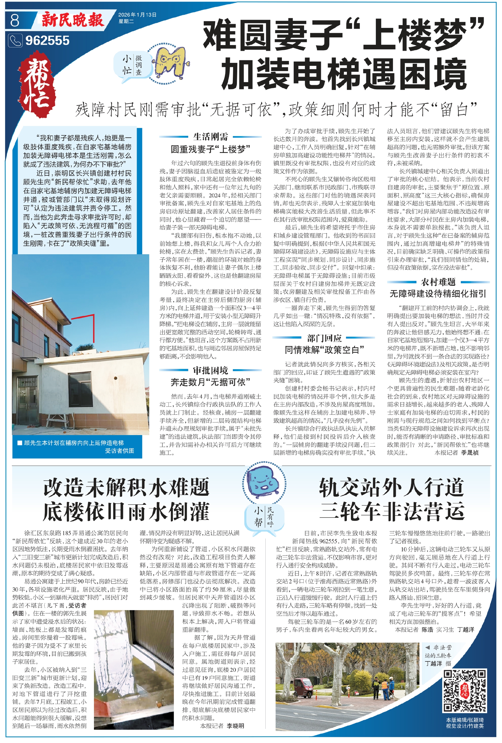 顾先生的遭遇,折射出农村地区一个更具普遍性的民生难题:随着老龄化社会的到来,农村地区对无障碍设施的需求日益增长,越来越多的老人、残障人士家庭有加装电梯的迫切需求,村民的刚需与现行规范之间如何找到平衡点?当类似的无障碍设施建设诉求再次出现时,能否有清晰的申请路径、审批标准和政策指引?对此,“新民帮侬忙”也将继续关注。 本报记者 季晟祯