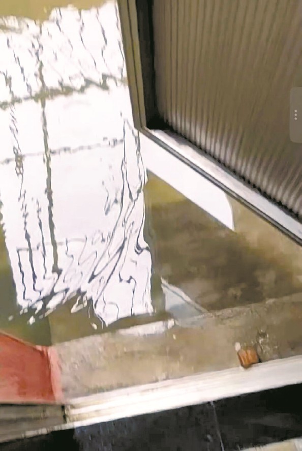 易通公寓建于上世纪90年代,房龄已经近30年,各项设施老化严重。居民反映,由于地势较低,小区一到暴雨天就要“排涝”,居民们对此苦不堪言(见下图,受访者供图)。住在一楼的郭先生展示了家中遭受浸水后的状况:墙面、地板上都是发霉的痕迹,房间里弥漫着一股霉味。他的妻子因为受不了家里长期发霉的环境,目前已搬到孩子家居住。