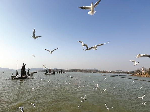 夏茗恬不记得从何时开始,冬季也成了无锡鼋头渚的旺季。作为景区宣传策划中心副经理,她见证了红嘴鸥是如何一步步成为可以和樱花相媲美的景区卖点的。“主要还是得益于红嘴鸥的数量,而且一年比一年多。”每年冬天,这些来自西伯利亚的小精灵都会南下,在太湖畔栖息,构成“鸟浪”奇观。