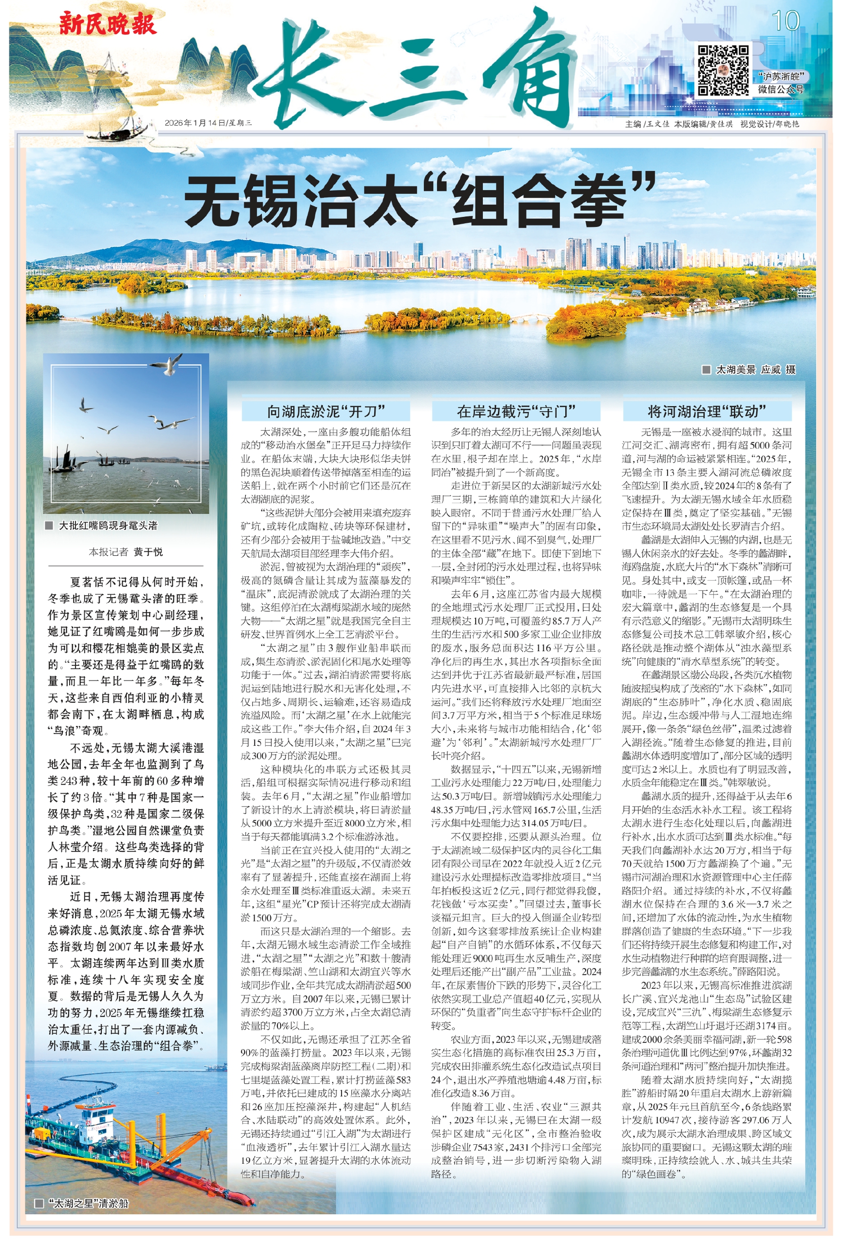 无锡是一座被水浸润的城市。这里江河交汇、湖湾密布,拥有超5000条河道,河与湖的命运被紧紧相连。“2025年,无锡全市13条主要入湖河流总磷浓度全部达到Ⅱ类水质,较2024年的8条有了飞速提升。为太湖无锡水域全年水质稳定保持在Ⅲ类,奠定了坚实基础。”无锡市生态环境局太湖处处长罗清吉介绍。