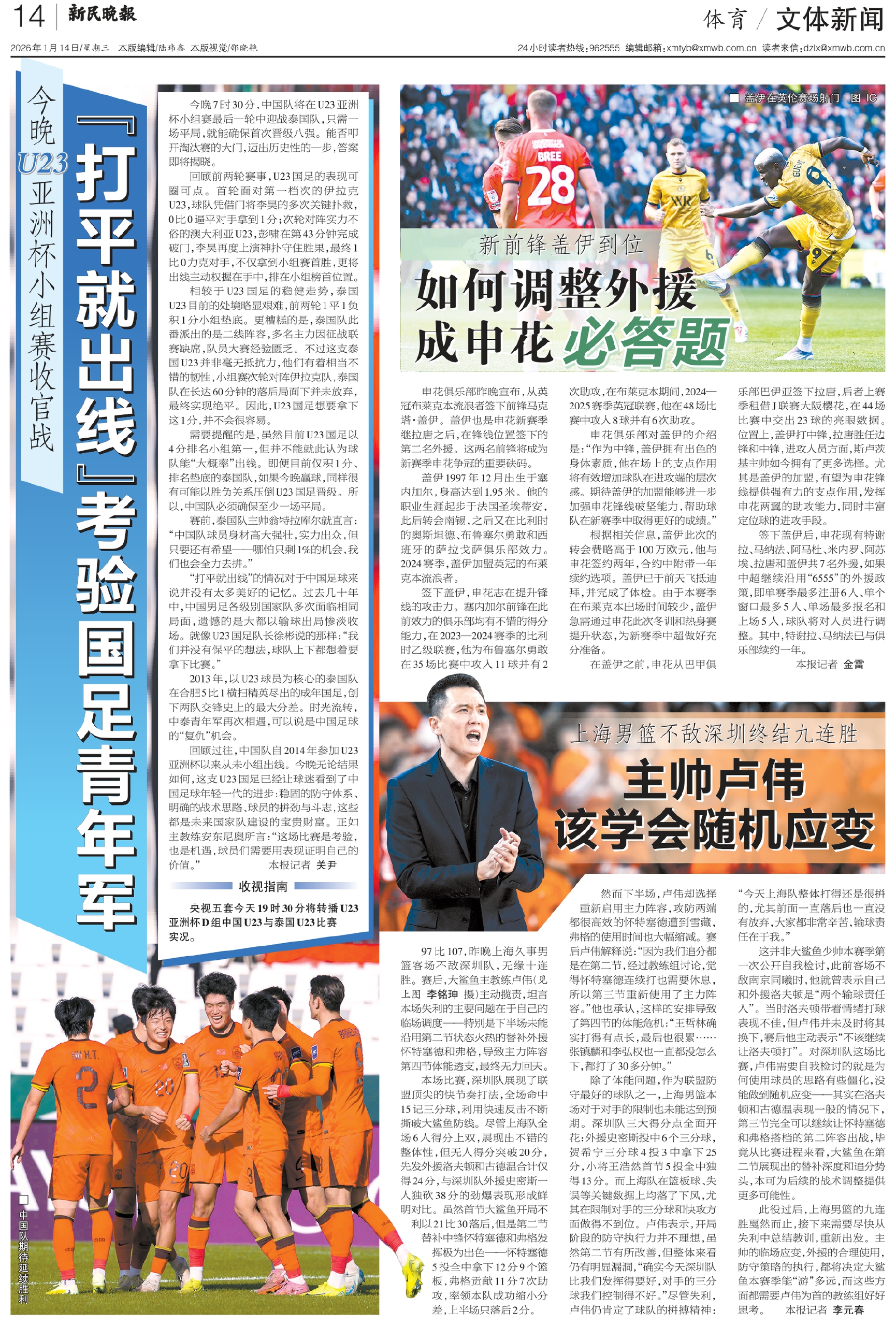 回顾过往,中国队自2014年参加U23亚洲杯以来从未小组出线。今晚无论结果如何,这支U23国足已经让球迷看到了中国足球年轻一代的进步:稳固的防守体系、明确的战术思路、球员的拼劲与斗志,这些都是未来国家队建设的宝贵财富。正如主教练安东尼奥所言:“这场比赛是考验,也是机遇,球员们需要用表现证明自己的价值。” 本报记者 关尹