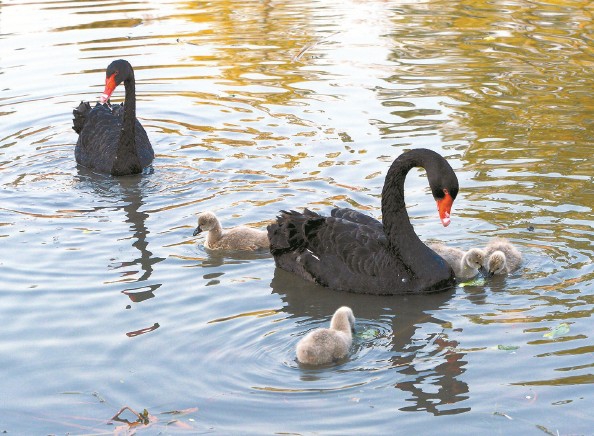 世纪公园镜天湖上,黑天鹅夫妇开启了新年新生活,带着刚出生的宝宝在暖阳下悠闲地嬉水游弋 杨建正 摄