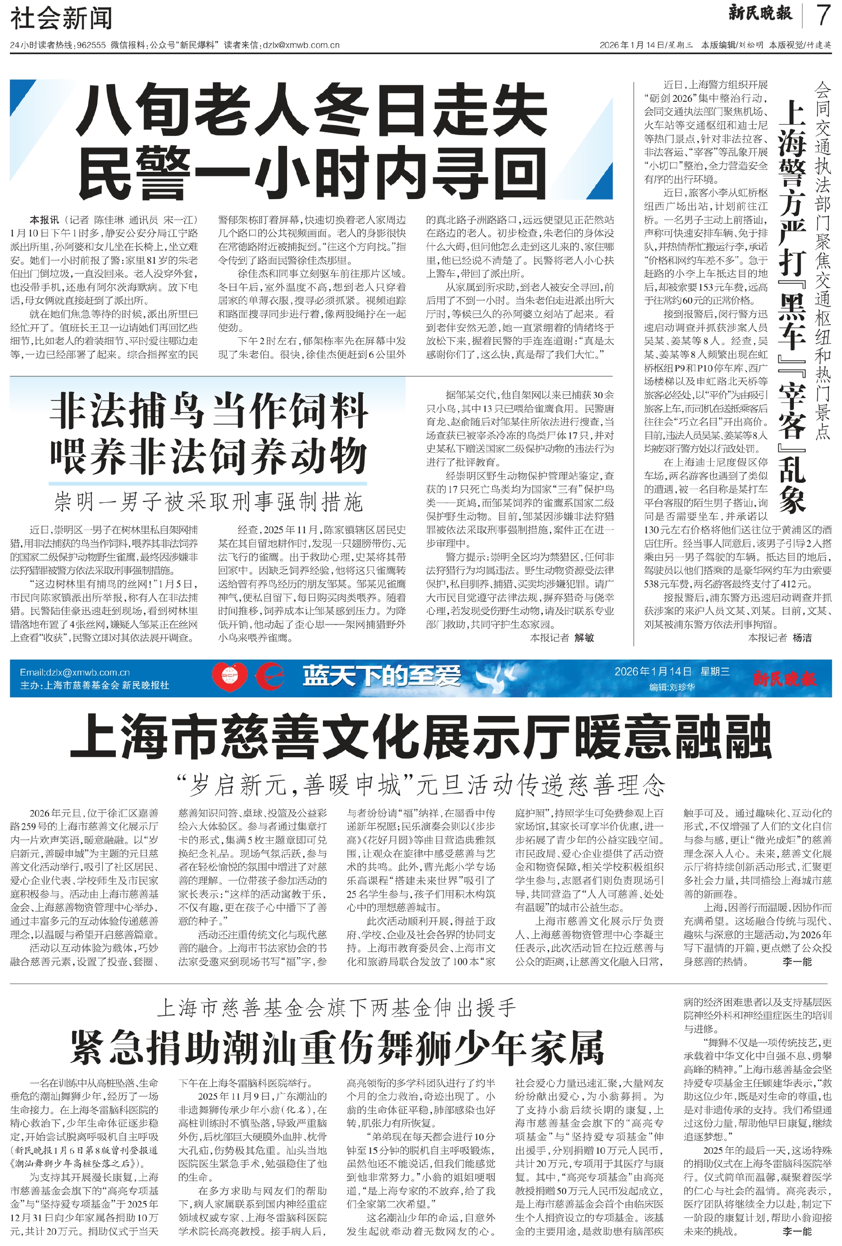 本报讯(记者 陈佳琳 通讯员 宋一江)1月10日下午1时多,静安公安分局江宁路派出所里,孙阿婆和女儿坐在长椅上,坐立难安。她们一小时前报了警:家里81岁的朱老伯出门倒垃圾,一直没回来。老人没穿外套,也没带手机,还患有阿尔茨海默病。放下电话,母女俩就直接赶到了派出所。