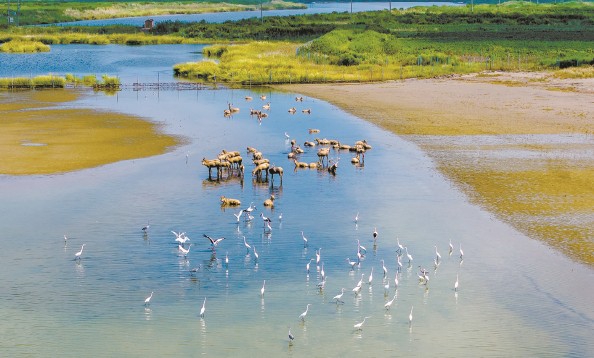 候鸟与麋鹿在黄海湿地栖息 孙家录