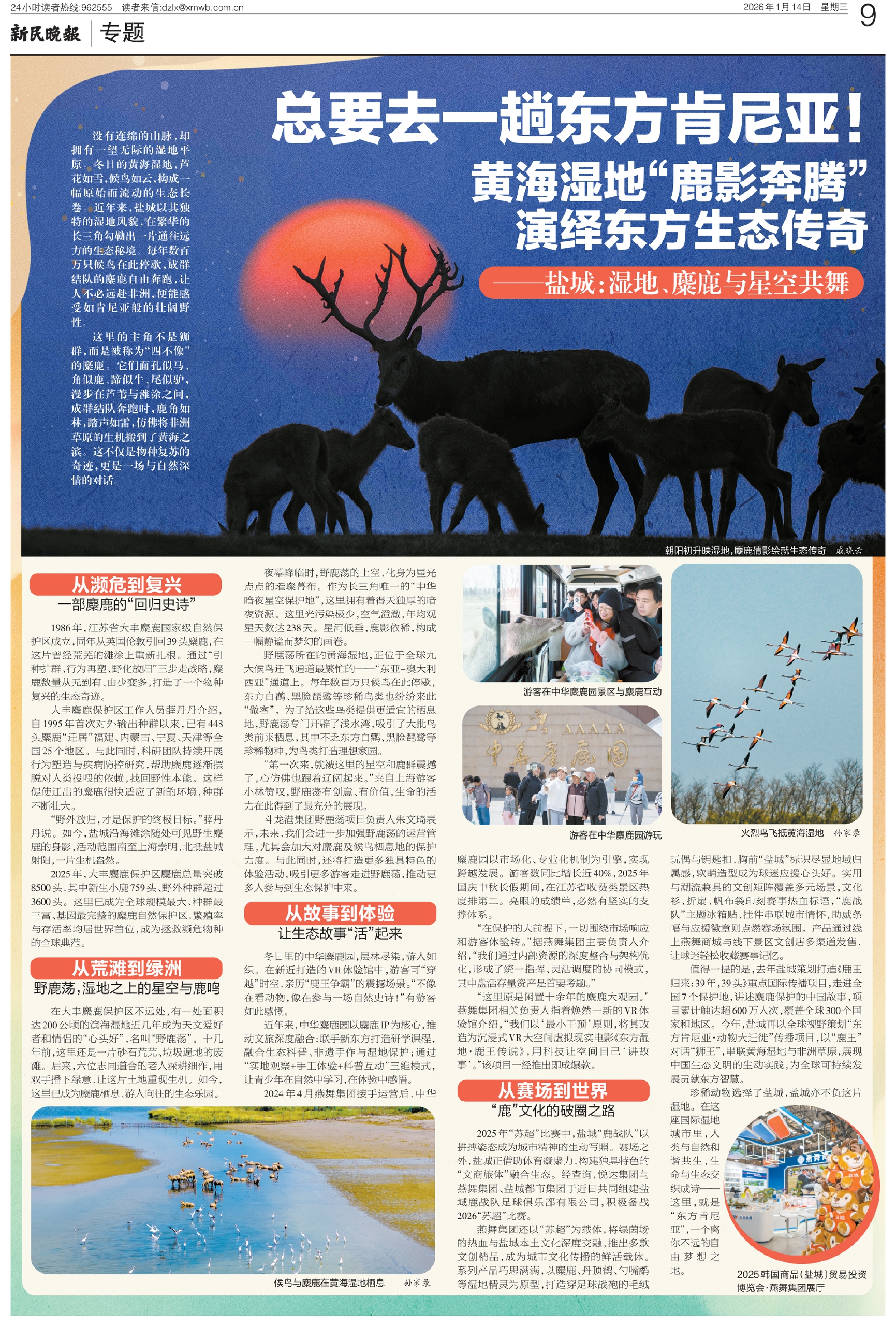 没有连绵的山脉,却拥有一望无际的湿地平原。冬日的黄海湿地,芦花如雪,候鸟如云,构成一幅原始而流动的生态长卷。近年来,盐城以其独特的湿地风貌,在繁华的长三角勾勒出一片通往远方的生态秘境。每年数百万只候鸟在此停歇,成群结队的麋鹿自由奔跑,让人不必远赴非洲,便能感受如肯尼亚般的壮阔野性。