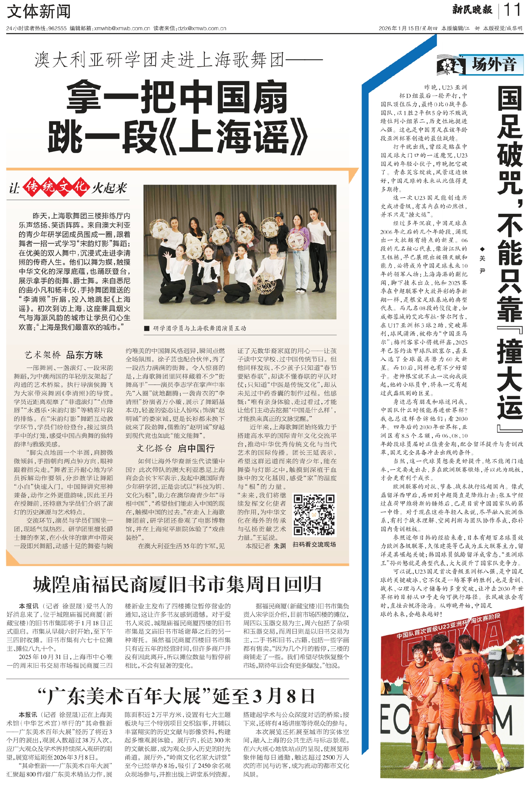 近年来,上海歌舞团始终致力于搭建高水平的国际青年文化交流平台,推动中华优秀传统文化与当代艺术的国际传播。团长王延表示,希望这群远道而来的青少年,能在舞姿与灯影之中,触摸到深植于血脉中的文化基因,感受“家”的温度与“根”的力量。“未来,我们将继续发挥文化使者的作用,为中华文化在海外的传承与弘扬贡献艺术力量。”王延说。