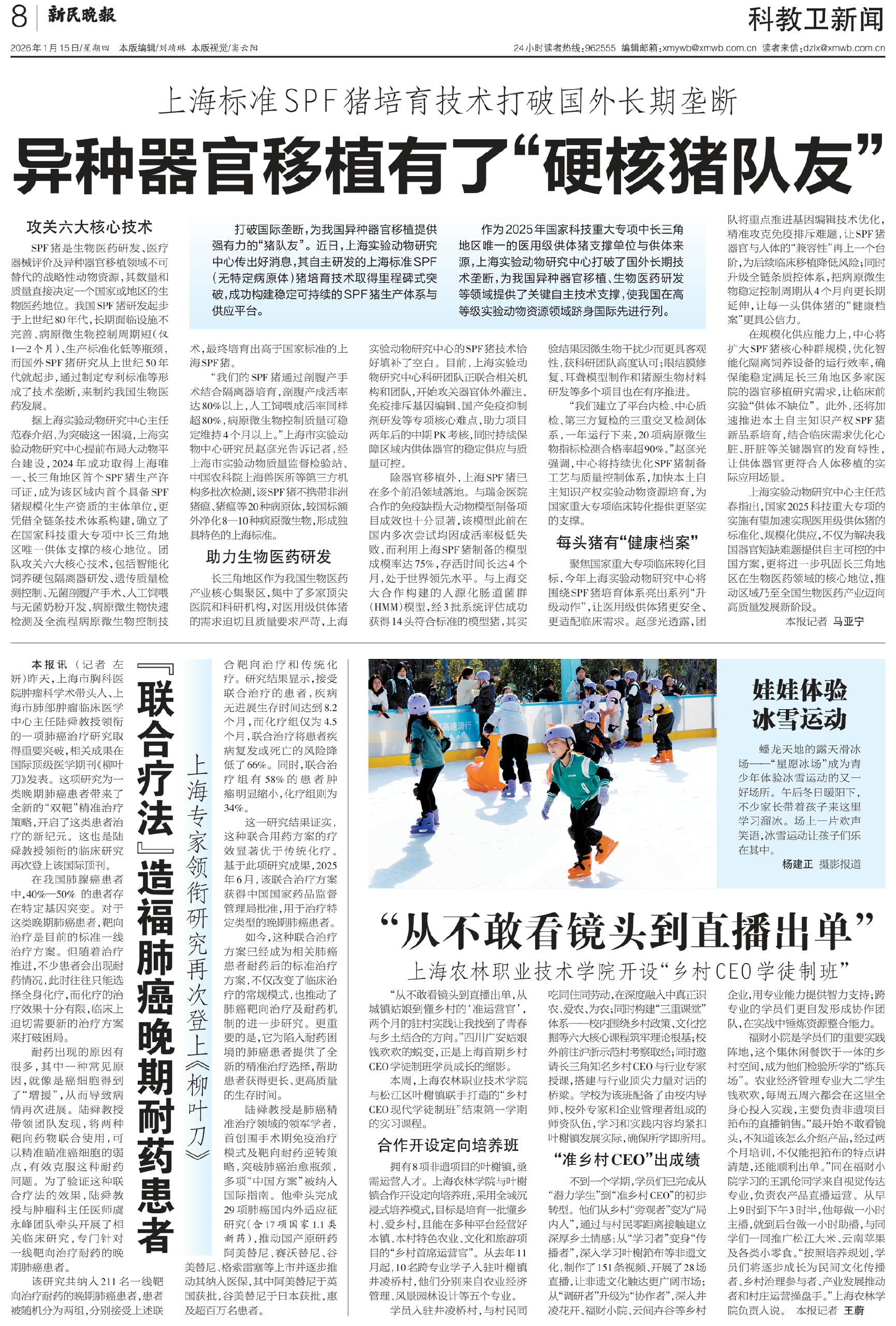 在规模化供应能力上,中心将扩大SPF猪核心种群规模,优化智能化隔离饲养设备的运行效率,确保能稳定满足长三角地区多家医院的器官移植研究需求,让临床前实验“供体不缺位”。此外,还将加速推进本土自主知识产权SPF猪新品系培育,结合临床需求优化心脏、肝脏等关键器官的发育特性,让供体器官更符合人体移植的实际应用场景。