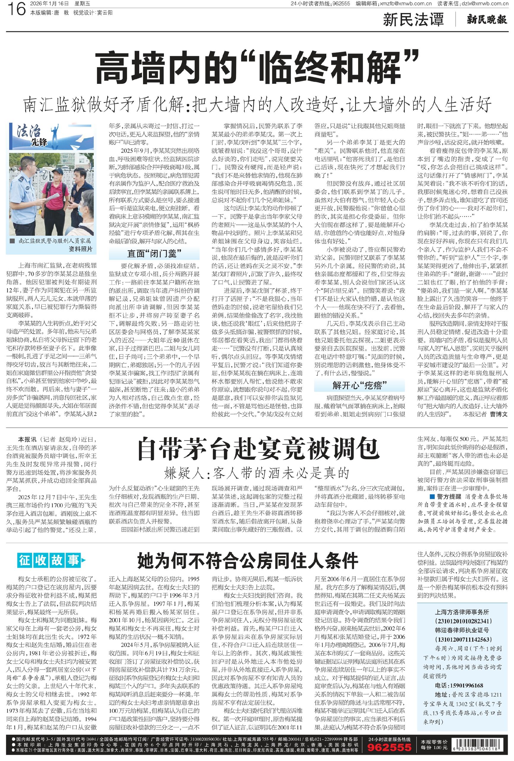 2025年9月,李某某突然出现咯血、呼吸困难等症状,经监狱医院诊断,为肺部感染合并呼吸衰竭3级,属于病危状态。按照规定,病危罪犯需有亲属作为监护人,配合医疗救治及后续事宜,但李某某的亲属联系簿上,所有联系方式要么是空号,要么接通后一听是监狱来电,便立刻挂断。看着病床上意识模糊的李某某,南汇监狱决定开展“亲情修复”,运用“枫桥经验”进行专项矛盾化解,帮其在生命最后阶段,解开与家人的心结。