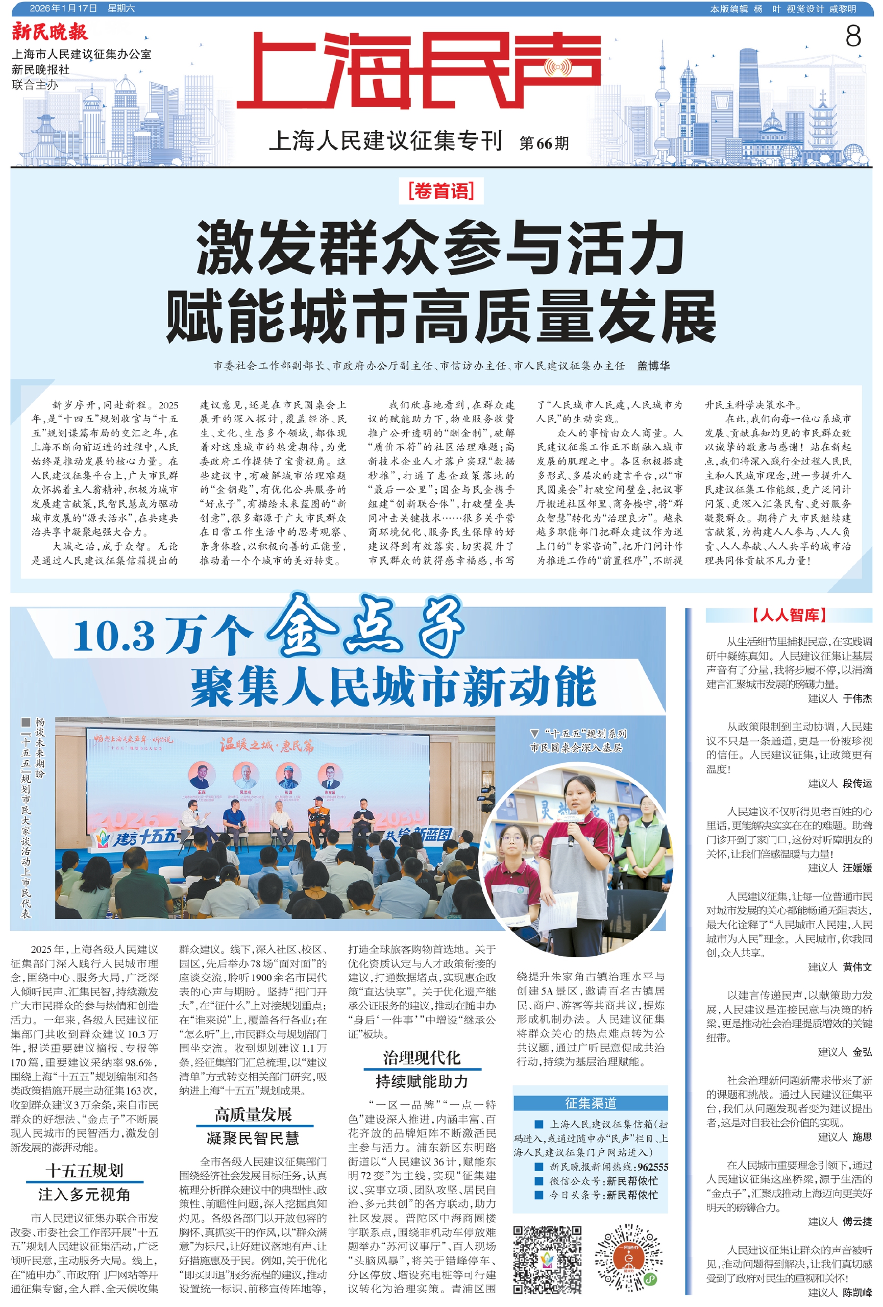 新岁序开,同赴新程。2025年,是“十四五”规划收官与“十五五”规划谋篇布局的交汇之年,在上海不断向前迈进的过程中,人民始终是推动发展的核心力量。在人民建议征集平台上,广大市民群众怀揣着主人翁精神,积极为城市发展建言献策,民智民慧成为驱动城市发展的“源头活水”,在共建共治共享中凝聚起强大合力。