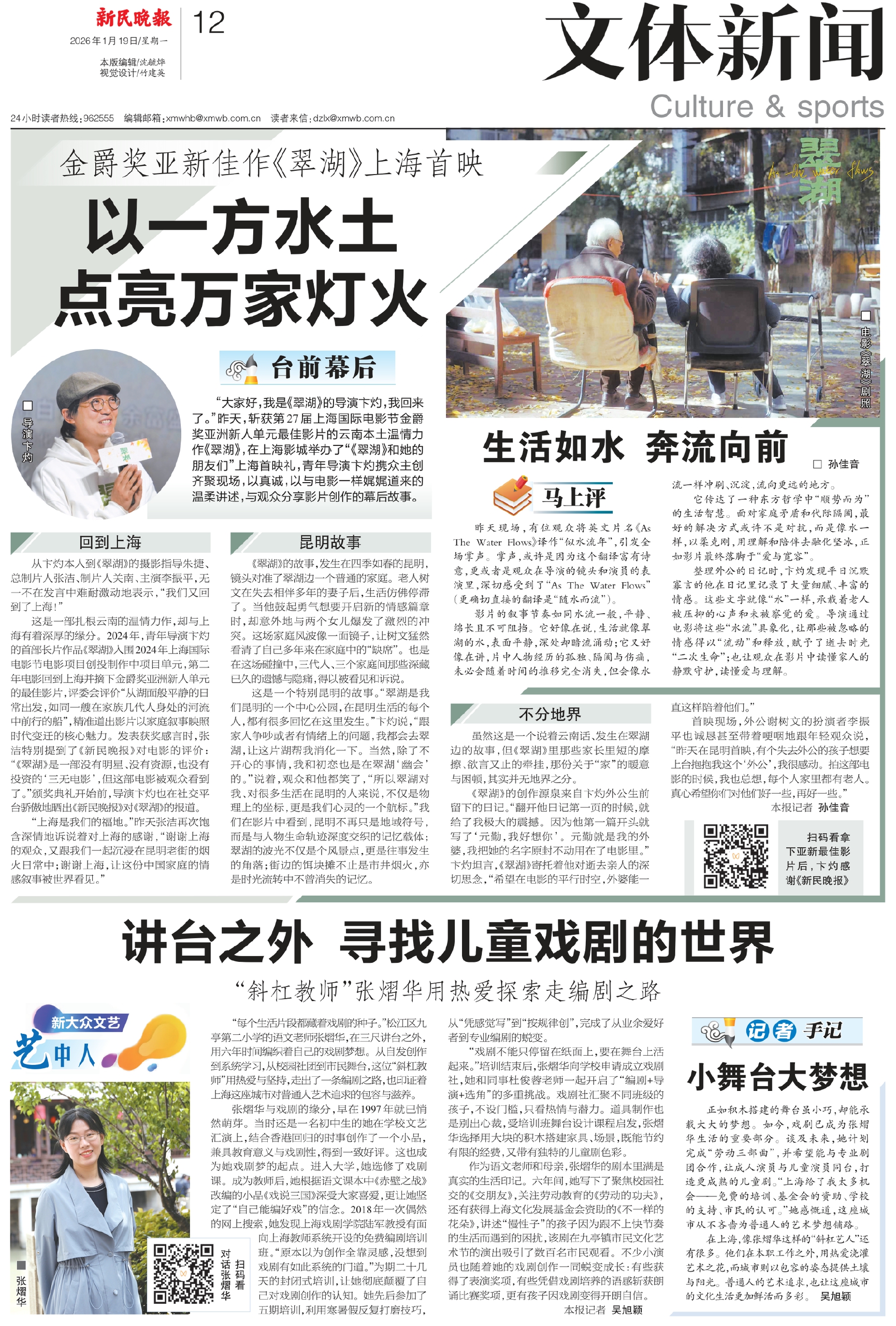 这是一部扎根云南的温情力作,却与上海有着深厚的缘分。2024年,青年导演卞灼的首部长片作品《翠湖》入围2024年上海国际电影节电影项目创投制作中项目单元,第二年电影回到上海并摘下金爵奖亚洲新人单元的最佳影片,评委会评价“从湖面般平静的日常出发,如同一艘在家族几代人身处的河流中前行的船”,精准道出影片以家庭叙事映照时代变迁的核心魅力。发表获奖感言时,张洁特别提到了《新民晚报》对电影的评价:“《翠湖》是一部没有明星、没有资源,也没有投资的‘三无电影’,但这部电影被观众看到了。”颁奖典礼开始前,导演卞灼也在社交平台骄傲地晒出《新民晚报》对《翠湖》的报道。
