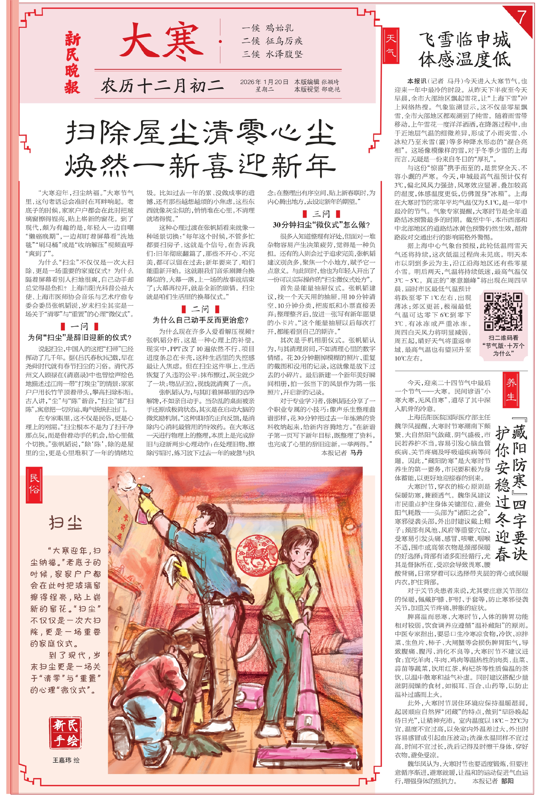 “大寒迎年,扫尘纳福。”大寒节气里,这句老话总会准时在耳畔响起。老底子的时候,家家户户都会在此时把玻璃窗擦得锃亮,贴上崭新的窗花。到了现代,颇为有趣的是,年轻人一边自嘲“懒癌晚期”,一边却盯着屏幕看“洗地毯”“刷马桶”或是“收纳解压”视频直呼“爽到了”。