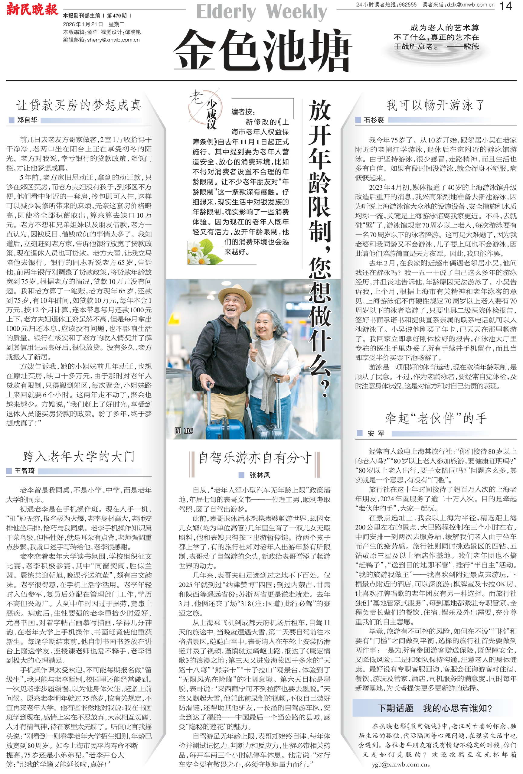 去年2月,在我家附近超市偶遇老邻居小吴,他问我还在游泳吗?我一五一十说了自己这么多年的游泳经历,并沮丧地告诉他,年龄原因无法游泳了。小吴告诉我,上个月,根据上海市有关精神和老年泳客的意见,上海游泳馆不再硬性规定70周岁以上老人要有70周岁以下的泳者陪游了,只要出具二级医院体检报告,签好书面承诺书和提供直系亲属的联系电话就可以入池游泳了。小吴说他刚买了年卡,已天天在那里畅游了。我回家立即拿好刚体检好的报告,在泳池大厅里专驻的医生手里办妥了所有手续并手机留存,而且当即享受半价买票下池畅游了。
