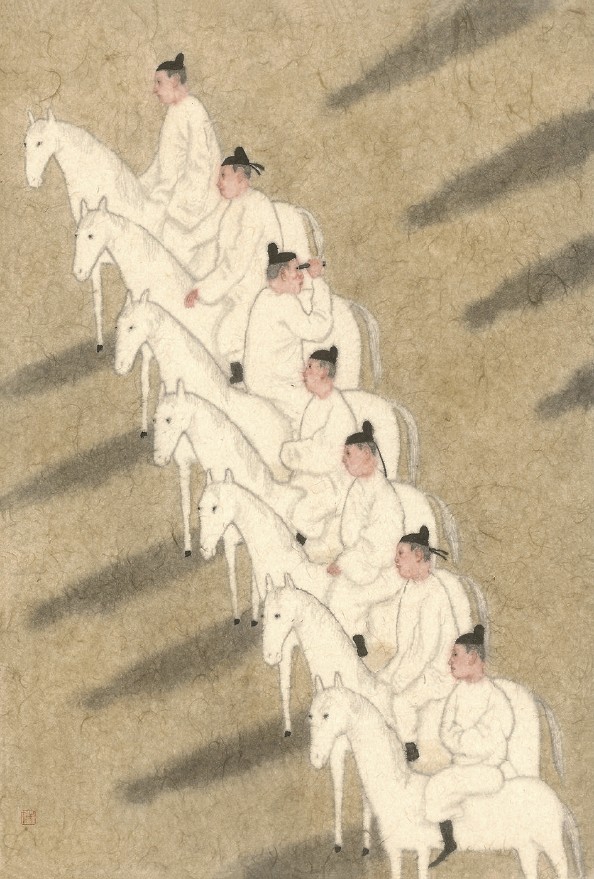 德国艺术家鲁普雷希特·冯·考夫曼以冷暖色狂乱笔触创作的《The Boxer》,呈现马的独特视觉冲击力量。艺术家代英伦的《人群——回首》(见下图)则以“白色”隐喻人与马的精神本真与自由。法国艺术家弗朗索瓦·邦内尔的《野马》则透过几何高彩色块,抽象地展现马的童趣,热情唤醒观众内在情感的愉悦。艺术家李梁晨的《时空山谷》以青绿山水设色,表现白马立于宛若仙境的神秘意境,与自然合而为一。每一位艺术家笔下的马,不仅是一个形体的存在,更是灵魂的投影——它或奔驰于光影裂缝,或静立于时间缝隙,或化为抽象的笔势,象征意志的冲撞,或以色彩线条的呼吸,传递生命的律动,在艺术之境自由奔行。