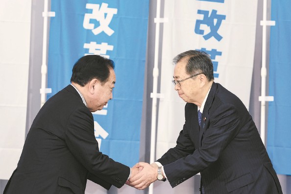 “中道改革联合”共同代表野田佳彦(左)与齐藤铁夫在建党大会上握手 新华社 发