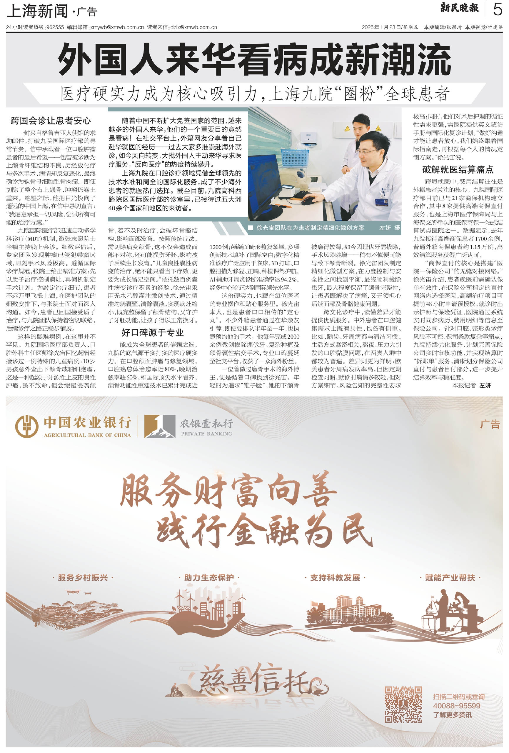跨境就医中,费用结算往往是外籍患者关注的核心。九院国际医疗部目前已与21家商保机构建立合作,其中8家提供高端商保直付服务,也是上海市医疗保障局与上海保交所牵头的医保商保一站式结算试点医院之一。数据显示,去年九院接待高端商保患者1700余例,普通外籍商保患者约1.15万例,高效结算服务获得广泛认可。