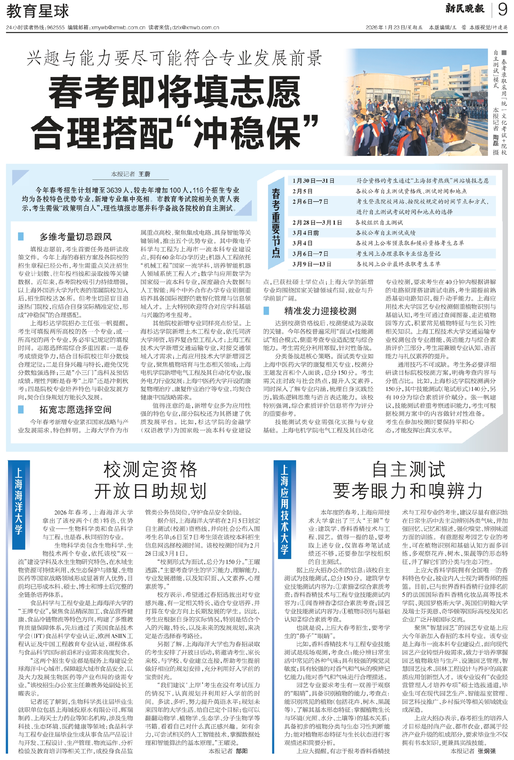 今年春考招生计划增至3639人,较去年增加100人,116个招生专业均为各校特色优势专业,新增专业集中亮相。市教育考试院相关负责人表示,考生需做“政策明白人”,理性填报志愿并科学备战各院校的自主测试。