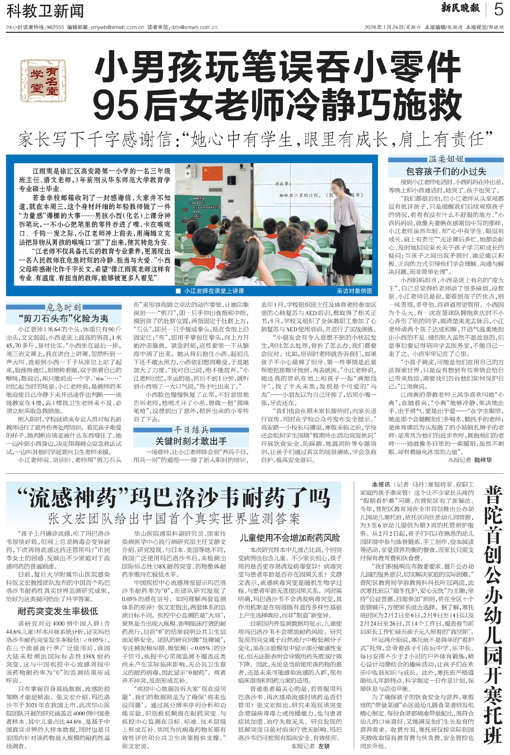江雨爽的带教老师王风华喜欢叫她“小爽”,在她看来,“小爽”能够冷静、果决地出手,出于勇气,更是出于爱——“在学生眼里,她是那个会提醒他们多喝水、勤洗手的老师;是体育课后为头发散了的小姑娘扎辫子的老师;是常常为他们的进步欢呼,拥抱他们的老师……她就像冬日里的一束暖阳,虽然不刺眼,却有着融化冰雪的力量”。本报记者 陆梓华