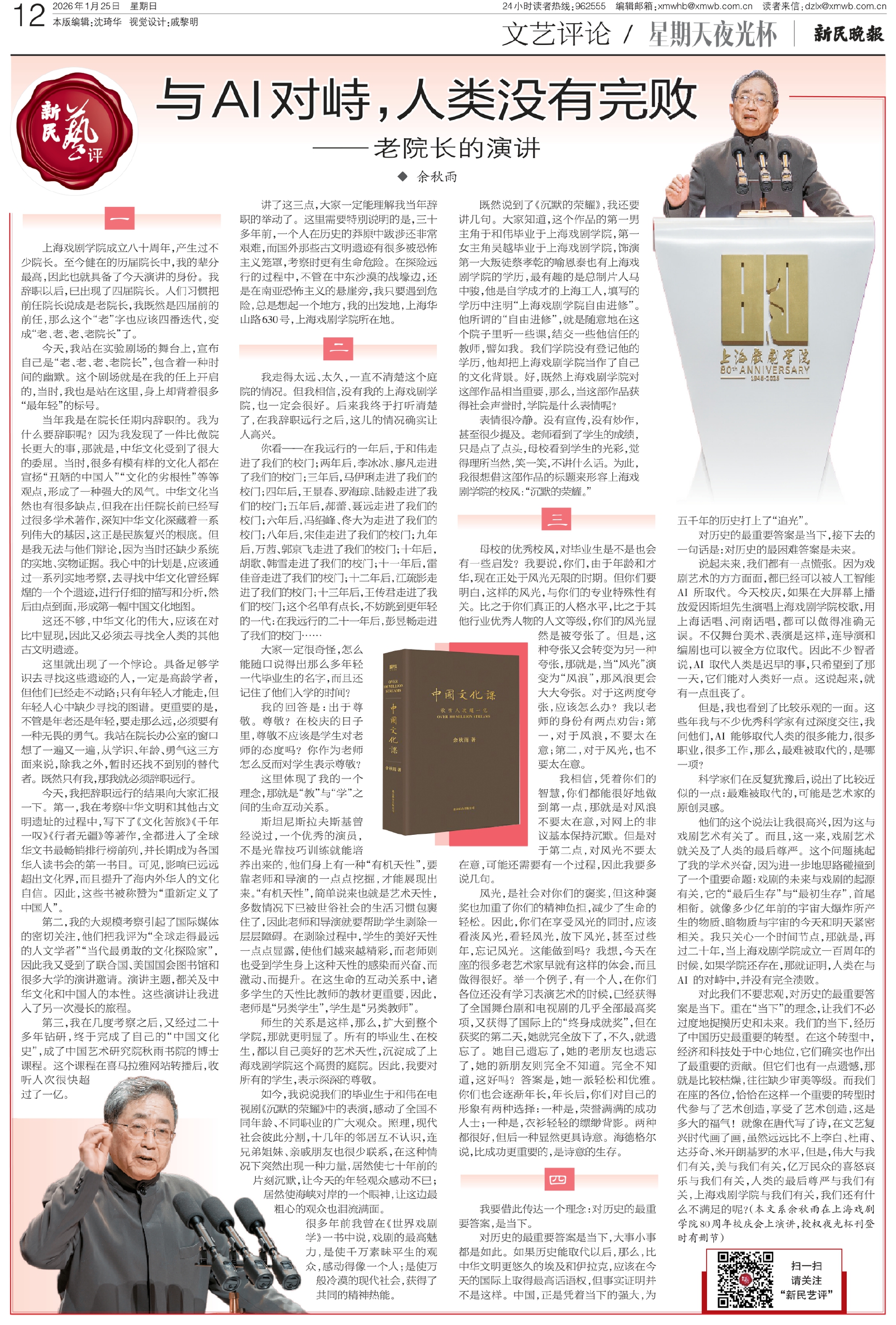 对此我们不要悲观,对历史的最重要答案是当下。重在“当下”的理念,让我们不必过度地捉摸历史和未来。我们的当下,经历了中国历史最重要的转型。在这个转型中,经济和科技处于中心地位,它们确实也作出了最重要的贡献。但它们也有一点遗憾,那就是比较枯燥,往往缺少审美等级。而我们在座的各位,恰恰在这样一个重要的转型时代参与了艺术创造,享受了艺术创造,这是多大的福气!就像在唐代写了诗,在文艺复兴时代画了画,虽然远远比不上李白、杜甫、达芬奇、米开朗基罗的水平,但是,伟大与我们有关,美与我们有关,亿万民众的喜怒哀乐与我们有关,人类的最后尊严与我们有关,上海戏剧学院与我们有关,我们还有什么不满足的呢?(本文系余秋雨在上海戏剧学院80周年校庆会上演讲,授权夜光杯刊登时有删节)