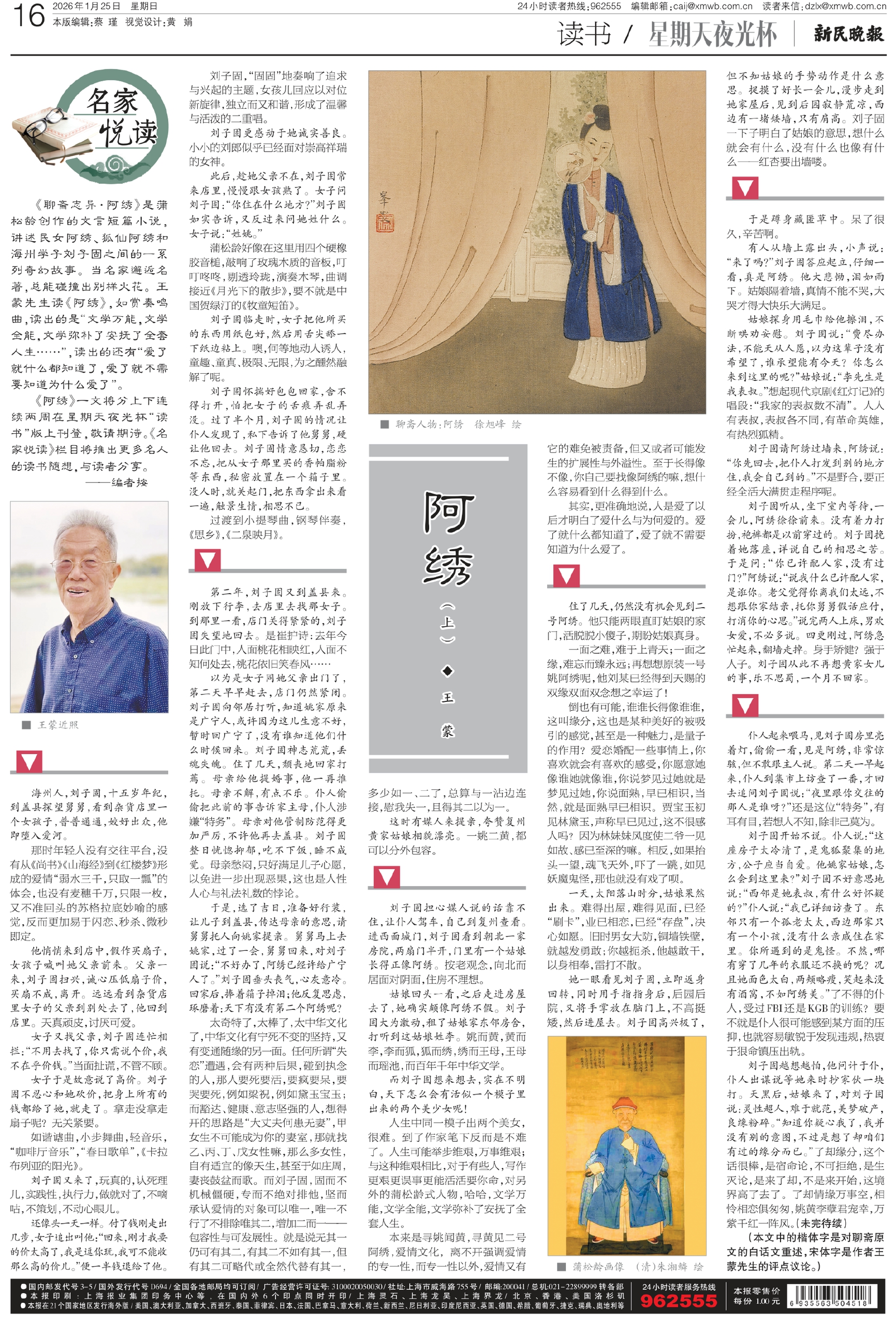 《聊斋志异·阿绣》是蒲松龄创作的文言短篇小说,讲述民女阿绣、狐仙阿绣和海州学子刘子固之间的一系列奇幻故事。当名家邂逅名著,总能碰撞出别样火花。王蒙先生读《阿绣》,如赏奏鸣曲,读出的是“文学万能,文学全能,文学弥补了安抚了全套人生……”,读出的还有“爱了就什么都知道了,爱了就不需要知道为什么爱了”。