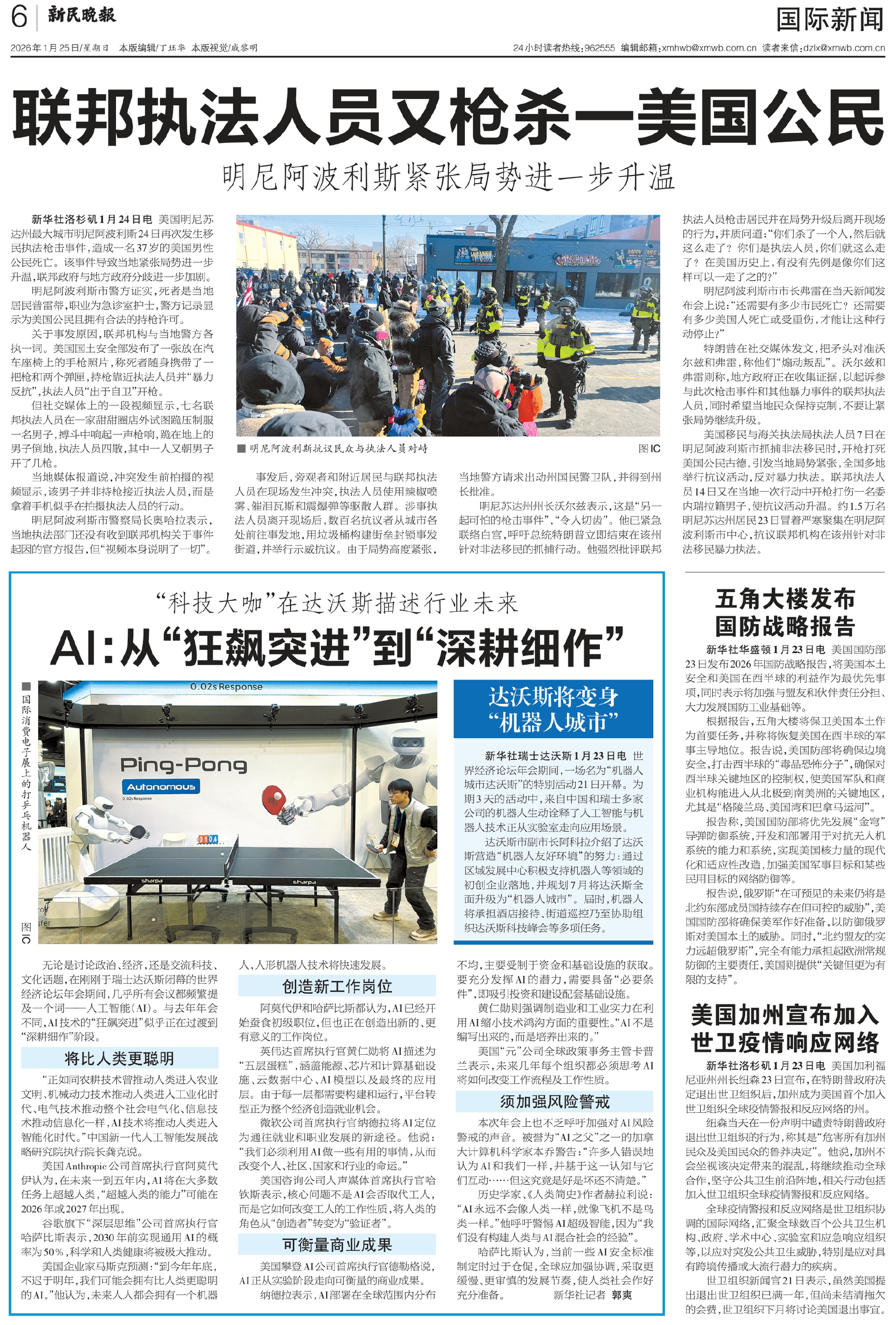 新华社洛杉矶1月24日电 美国明尼苏达州最大城市明尼阿波利斯24日再次发生移民执法枪击事件,造成一名37岁的美国男性公民死亡。该事件导致当地紧张局势进一步升温,联邦政府与地方政府分歧进一步加剧。