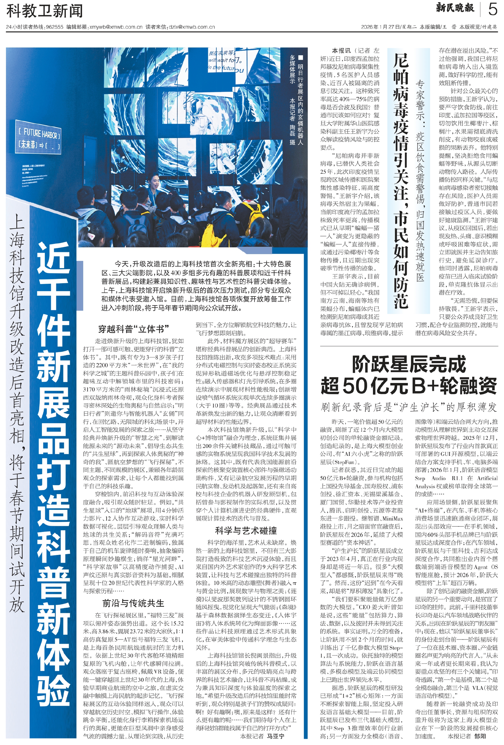 今天,升级改造后的上海科技馆首次全新亮相:十大特色展区、三大尖端影院,以及400多组多元有趣的科普展项和近千件科普新展品,构建起兼具知识性、趣味性与艺术性的科普尖峰体验。上午,上海科技馆开启焕新升级后的首次压力测试,部分专业观众和媒体代表受邀入馆。目前,上海科技馆各项恢复开放筹备工作进入冲刺阶段,将于马年春节期间向公众试开放。