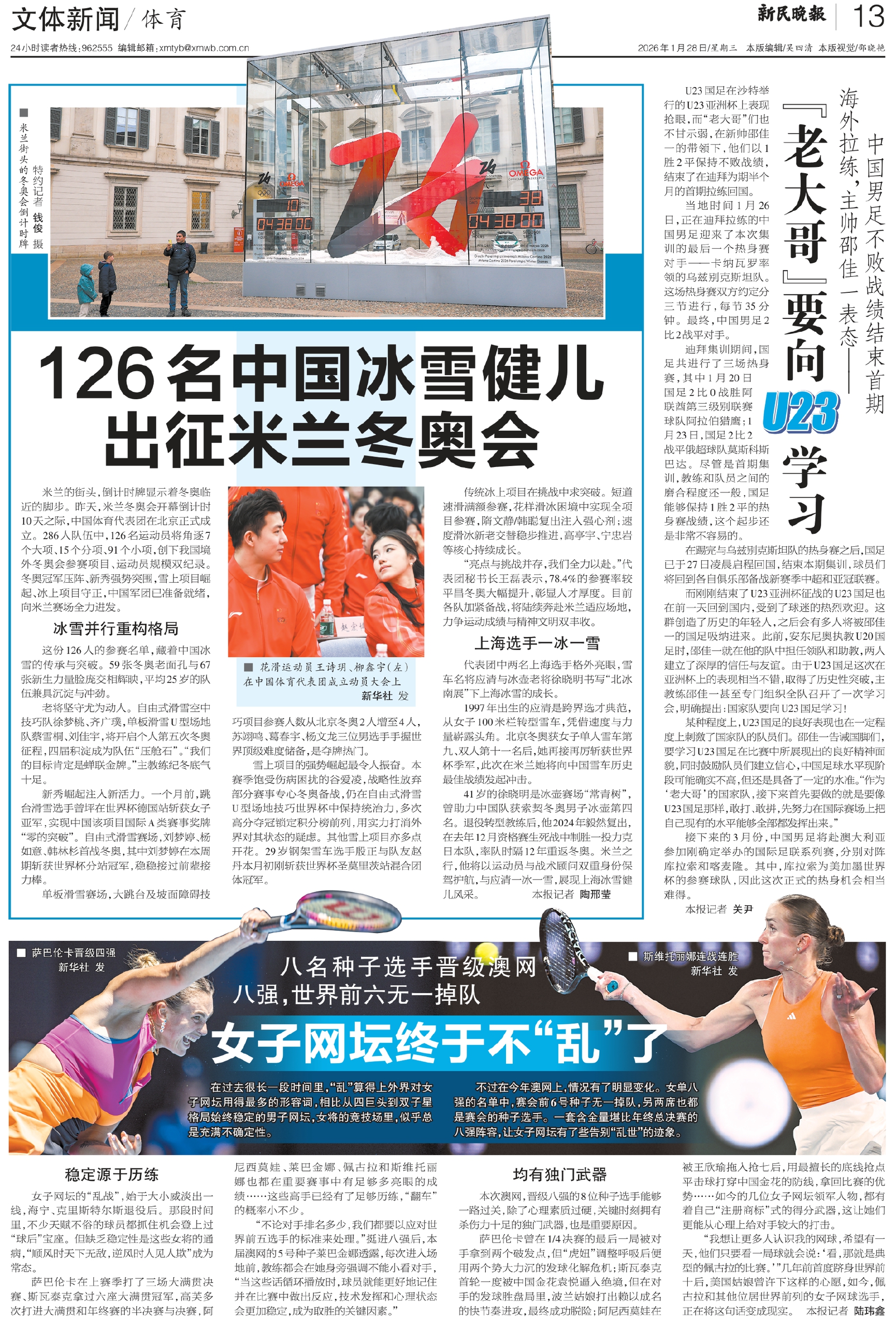 米兰的街头,倒计时牌显示着冬奥临近的脚步。昨天,米兰冬奥会开幕倒计时10天之际,中国体育代表团在北京正式成立。286人队伍中,126名运动员将角逐7个大项、15个分项、91个小项,创下我国境外冬奥会参赛项目、运动员规模双纪录。冬奥冠军压阵、新秀强势突围,雪上项目崛起、冰上项目守正,中国军团已准备就绪,向米兰赛场全力进发。