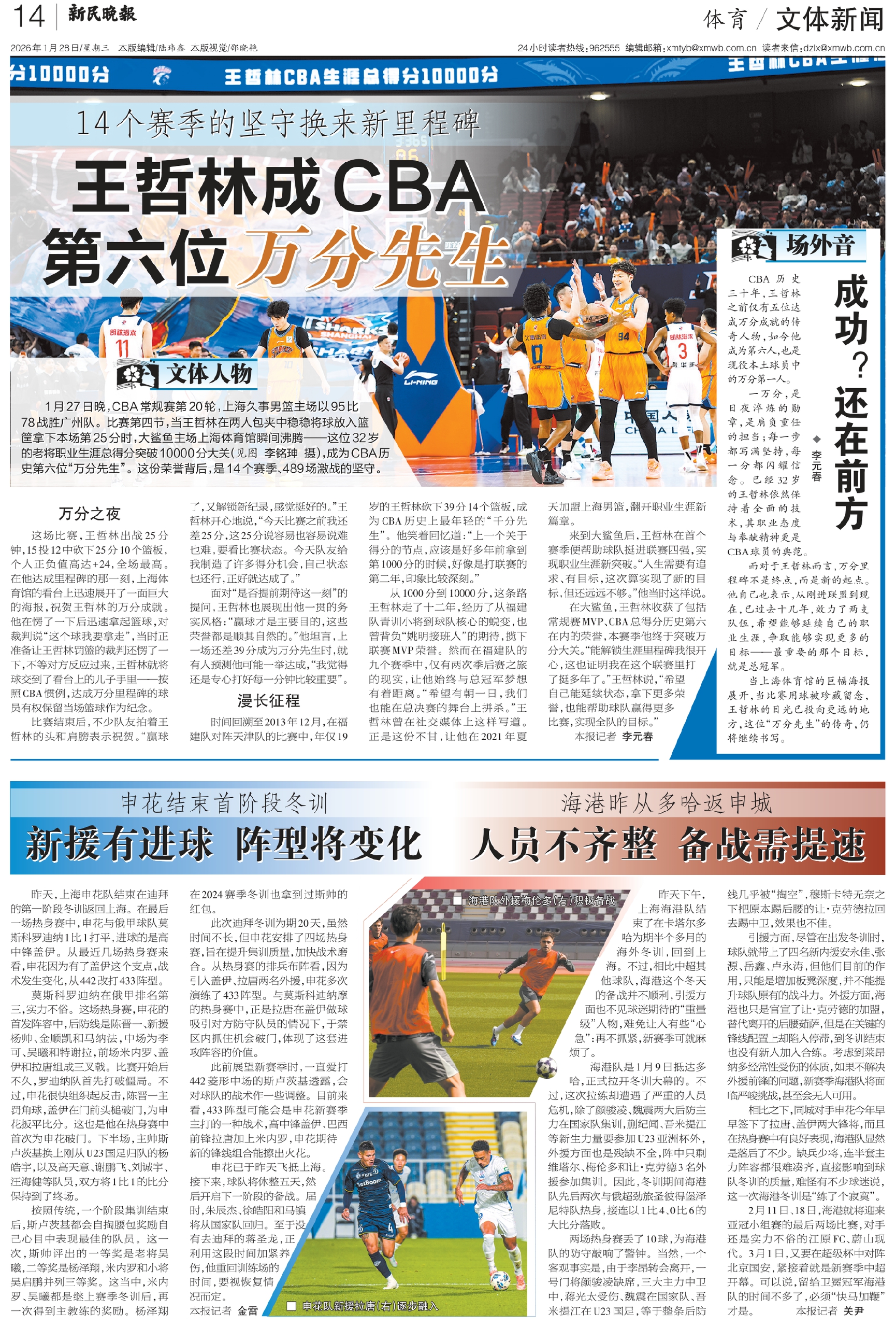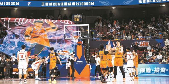 1月27日晚,CBA常规赛第20轮,上海久事男篮主场以95比78战胜广州队。比赛第四节,当王哲林在两人包夹中稳稳将球放入篮筐拿下本场第25分时,大鲨鱼主场上海体育馆瞬间沸腾——这位32岁的老将职业生涯总得分突破10000分大关(见图 李铭珅 摄),成为CBA历史第六位“万分先生”。这份荣誉背后,是14个赛季、489场激战的坚守。