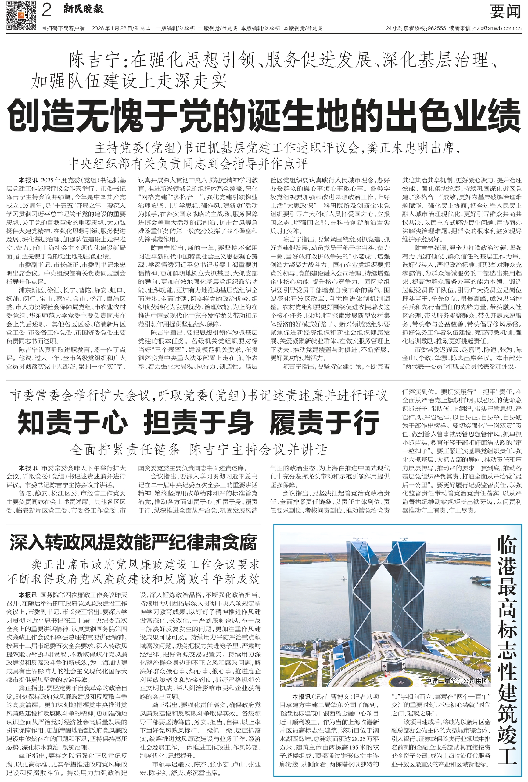 本报讯 2025年度党委(党组)书记抓基层党建工作述职评议会昨天举行。市委书记陈吉宁主持会议并强调,今年是中国共产党成立105周年,是“十五五”开局之年。要深入学习贯彻习近平总书记关于党的建设的重要思想、关于党的自我革命的重要思想,大力弘扬伟大建党精神,在强化思想引领、服务促进发展、深化基层治理、加强队伍建设上走深走实,奋力开创上海社会主义现代化建设新局面,创造无愧于党的诞生地的出色业绩。