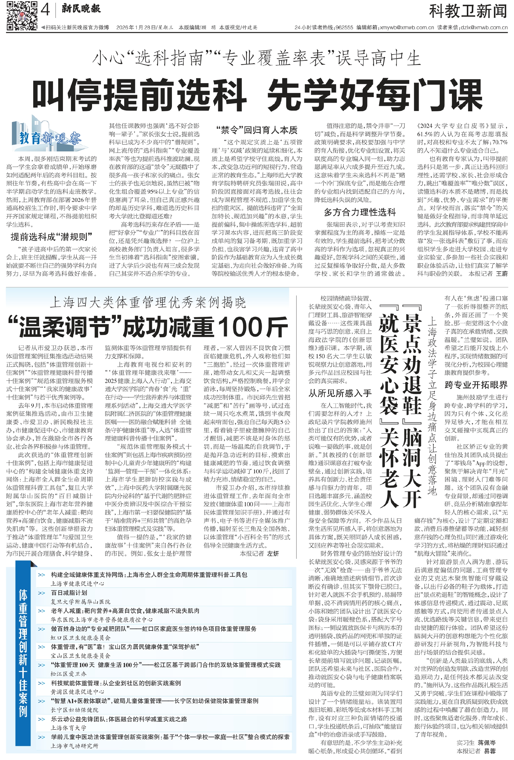 高考选科历来存在矛盾——是把“好拿分”“专业广”的科目放在首位,还是凭兴趣做选择?一位沪上高校教务部门负责人坦言,很多学生当初捧着“选科指南”按图索骥,进了大学后少说也有两三成会发现自己其实并不适合所学的专业。