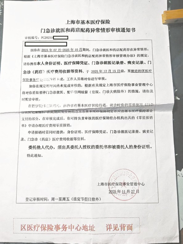 针对万女士的诸多疑惑,记者联系医保部门作答。工作人员回应,经大数据监测,2025年7月至10月期间,万女士母亲存在“两个异常”情形。2025年11月27日,上海市医疗保险事业管理中心已向其寄送《上海市基本医疗保险门急诊就医和药店配药异常情形审核通知书》,要求参保人员携带身份证明、医保凭证、门急诊就医记录册、病史记录及费用收据等资料,于当年12月15日前到就近区医保事务中心办理审核手续。