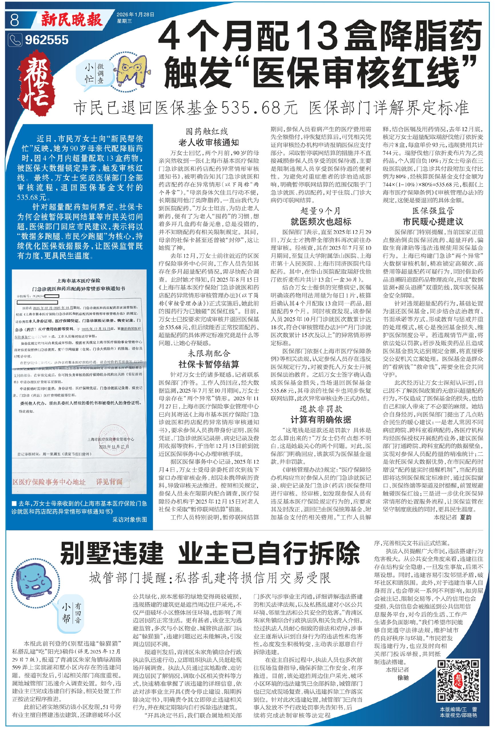 《审核管理办法》规定:“医疗保障经办机构应当对参保人员的门急诊就医记录、病史记录及门急诊(药店)医保费用进行审核。经审核,如发现参保人员有违反基本医疗保险规定行为的,应要求其及时改正,退回已由医保统筹基金、附加基金支付的相关费用。”工作人员解释,结合医嘱及用药情况,去年12月底,核定万女士超量配取瑞舒伐他汀依折麦布片8盒,每盒单价93元,违规费用共计744元。瑞舒伐他汀依折麦布片为乙类药品,个人需自负10%;万女士母亲在三级医院就医,门急诊共付段附加支付比例为80%,经核算医保基金支付金额为744×(1-10%)×80%=535.68元,根据《上海市医疗保障条例》《审核管理办法》的规定,这便是要退回的具体金额。