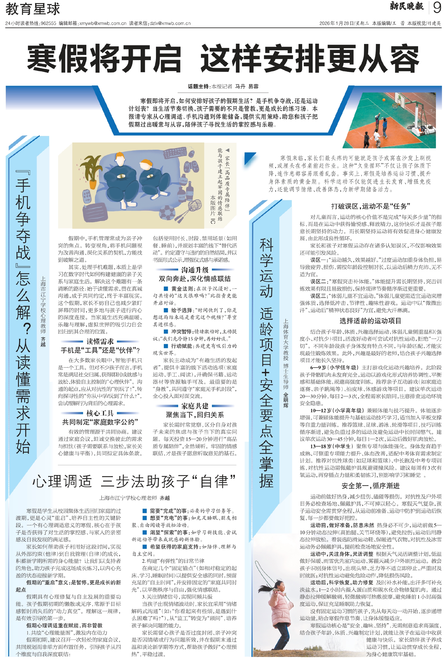 寒假即将开启,如何安排好孩子的假期生活?是手机争夺战,还是运动计划表?当生活节奏切换,孩子需要的不只是管教,更是成长的练习场。本报请专家从心理调适、手机沟通到体能储备,提供实用策略,助您和孩子把假期过出暖意与从容,陪伴孩子寻找生活的掌控感与乐趣。