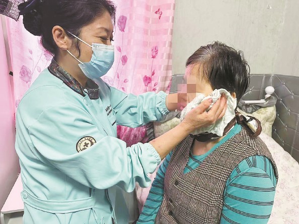 护理员吴阿姨在陈奶奶家中,为她进行日常清洁