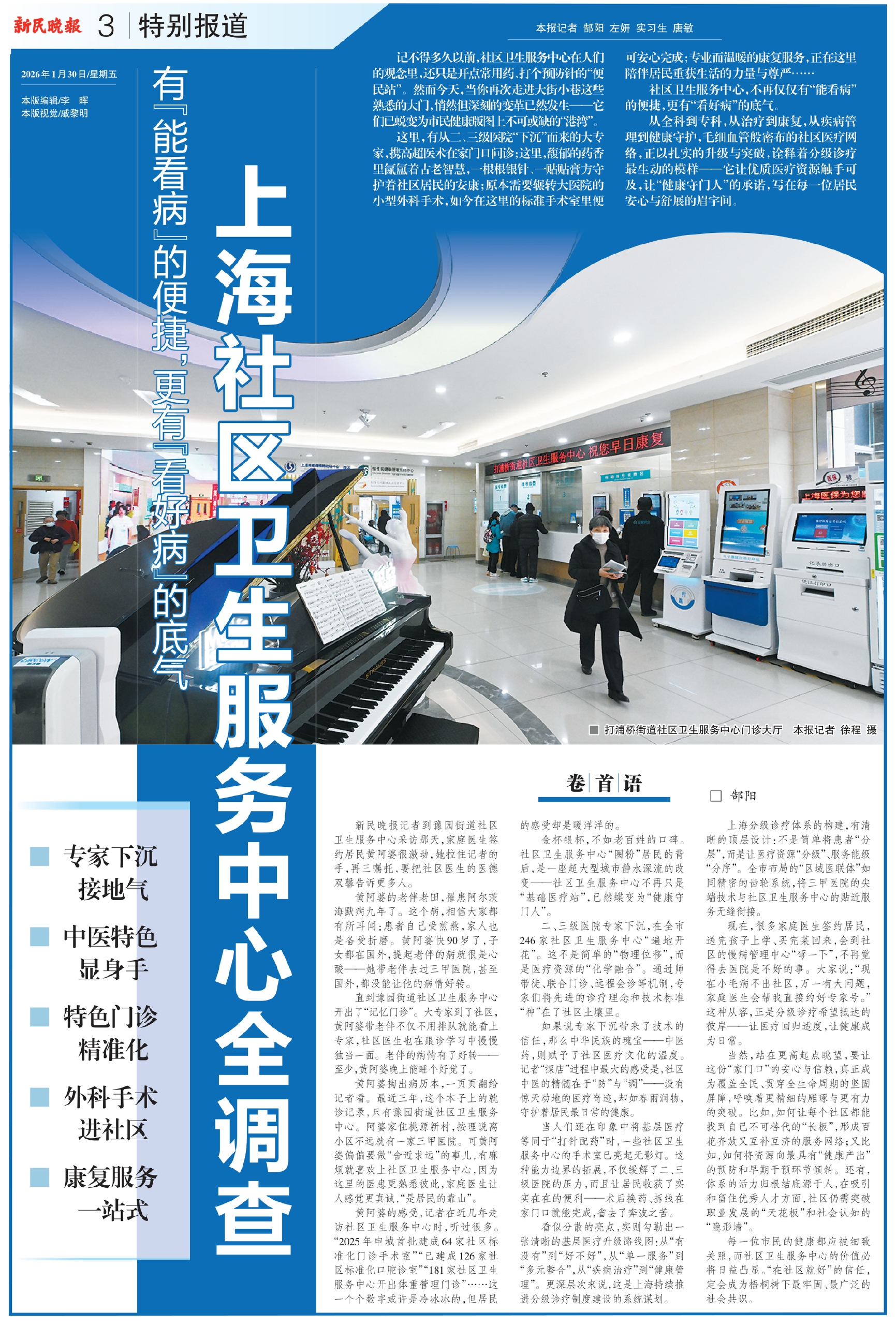 黄阿婆的感受,记者在近几年走访社区卫生服务中心时,听过很多。“2025年申城首批建成64家社区标准化门诊手术室”“已建成126家社区标准化口腔诊室”“181家社区卫生服务中心开出体重管理门诊”……这一个个数字或许是冷冰冰的,但居民的感受却是暖洋洋的。