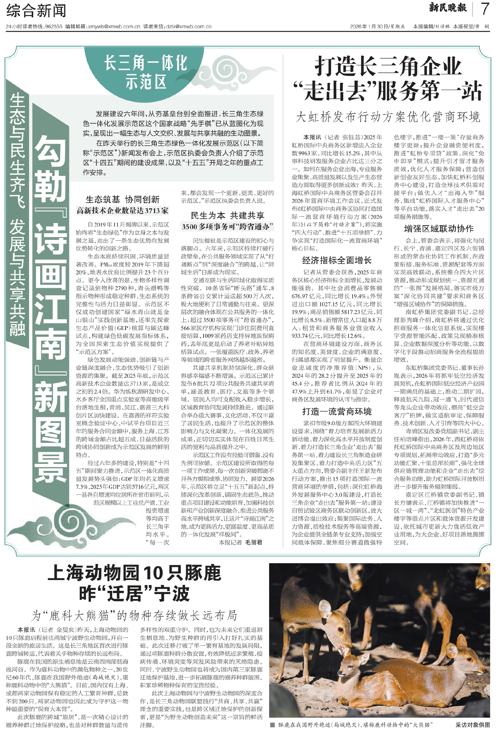 示范区工作没有经验可借鉴、没有先例可依循。示范区建设所取得的每一项工作成果、每一次创新突破都离不开各方握指成拳、协同发力。展望2026年,示范区将立足“十五五”新起点,持续深化改革创新,锚固生态底色,推动重点项目建设和功能培育,加强科技创新和产业创新深度融合,推进公共服务高水平跨域共享,让这片“诗画江南”之地,成为更具活力、更富温度、更高品质的一体化发展“样板间”。