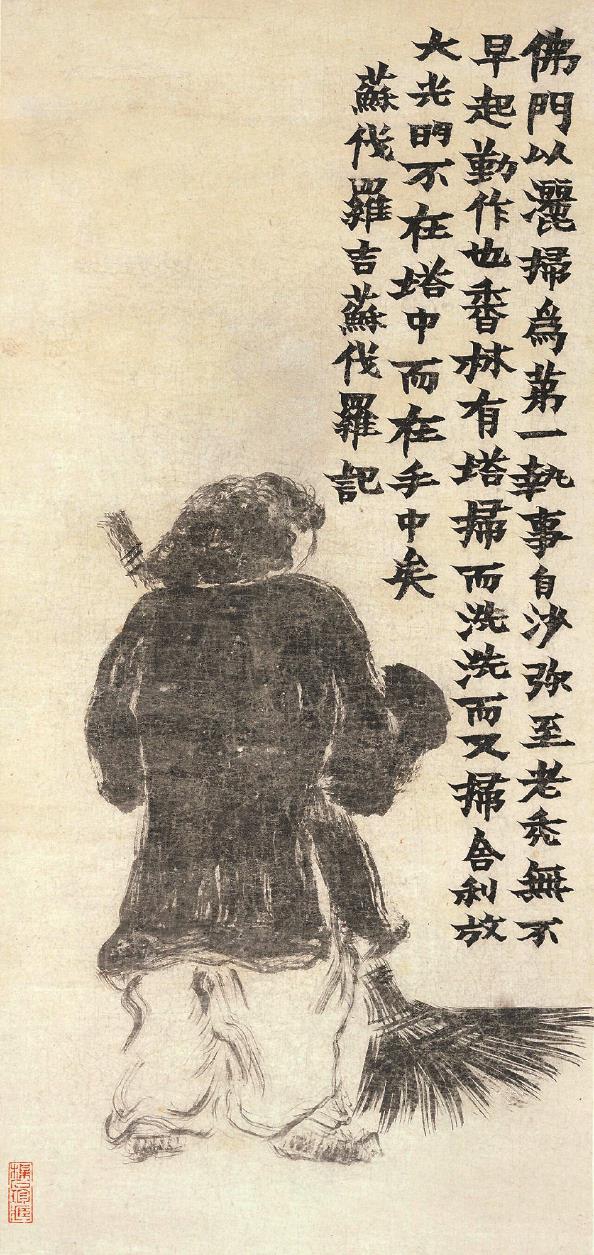 从历史烟尘中回到人间的金农,其历史面目有赖他众多留传于世的书画,通过书画勾勒出一个杭州人独有的气象。我们回看金农晚年那张侧着身子,拖着一根细辫子,身体有点臃肿,眼睛老花,手持藤杖缓行的自画像,可能能辨别当时金农精神气。罗聘也画过《金农像》,特别是金农手里的那本梵文经书,会让人联想到金农所处时代梵文遍布社会的各个角落,那是当时世俗生活里的时尚。作为弟子的罗聘,自然了解乃师的性情,故画笔下的形象接近于真实生活里的金农。画中捻须执书的金农,手执梵文经书,一副老儒的派头。金农曾用梵文的“苏伐罗”读音替代“金”,并刻入印章,除了流露出其拥有某种外语能力,也显示了金农学识的赅博。