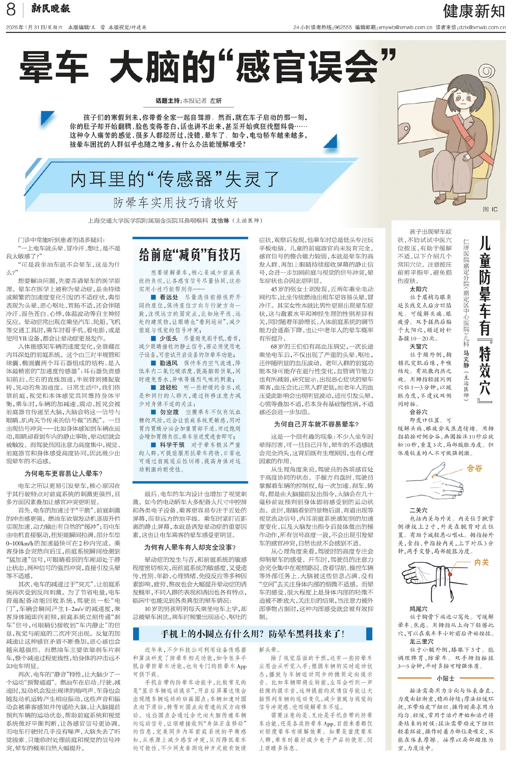 人体能感知车辆的速度变化,全靠藏在内耳深处的前庭系统。这个由三对半规管和球囊、椭圆囊两个耳石器组成的结构,是人体最精密的“加速度传感器”:耳石器负责感知前后、左右的直线加速,半规管则捕捉旋转、晃动的角加速度。日常生活中,我们依靠前庭、视觉和本体感觉共同维持身体平衡,乘车时,车辆的加减速、震动、摇晃会被前庭器官传递至大脑,大脑会将这一信号与眼睛、肌肉关节传来的信号做“匹配”。一旦出现信号冲突——比如身体感知到车辆在运动,眼睛却看到车内的静止事物,晕动症就会被触发。而驾驶员因注意力高度集中,视觉、前庭器官和身体感受高度协同,因此极少出现晕车的不适感。