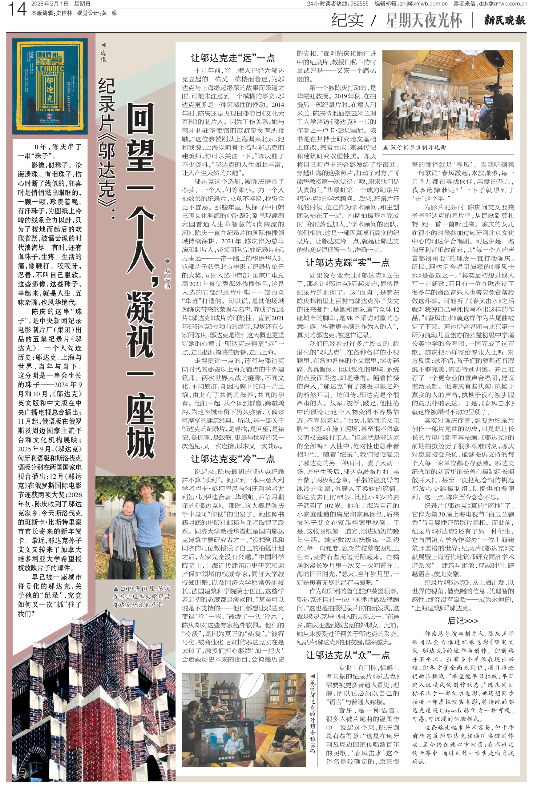 陈庆的这串“珠子”,是中央新闻纪录电影制片厂(集团)出品的五集纪录片《邬达克》。一个人勾连历史:邬达克、上海与世界、当年与当下。这分明是一串会生长的珠子——2024年9月和10月,《邬达克》英文版和中文版在中央广播电视总台播出;11月起,俄语版在俄罗斯及周边国家主流平台和文化机构展映;2025年9月,《邬达克》匈牙利语版和斯洛伐克语版分别在两国国家电视台播出;12月《邬达克》在俄罗斯国际电影节连获两项大奖;2026年初,陈庆收到了邬达克家乡、今天斯洛伐克的班斯卡·比斯特里察市市长寄来的新年贺卡。最近,邬达克孙子艾文又转来了加拿大维多利亚大学希望授权放映片子的邮件。