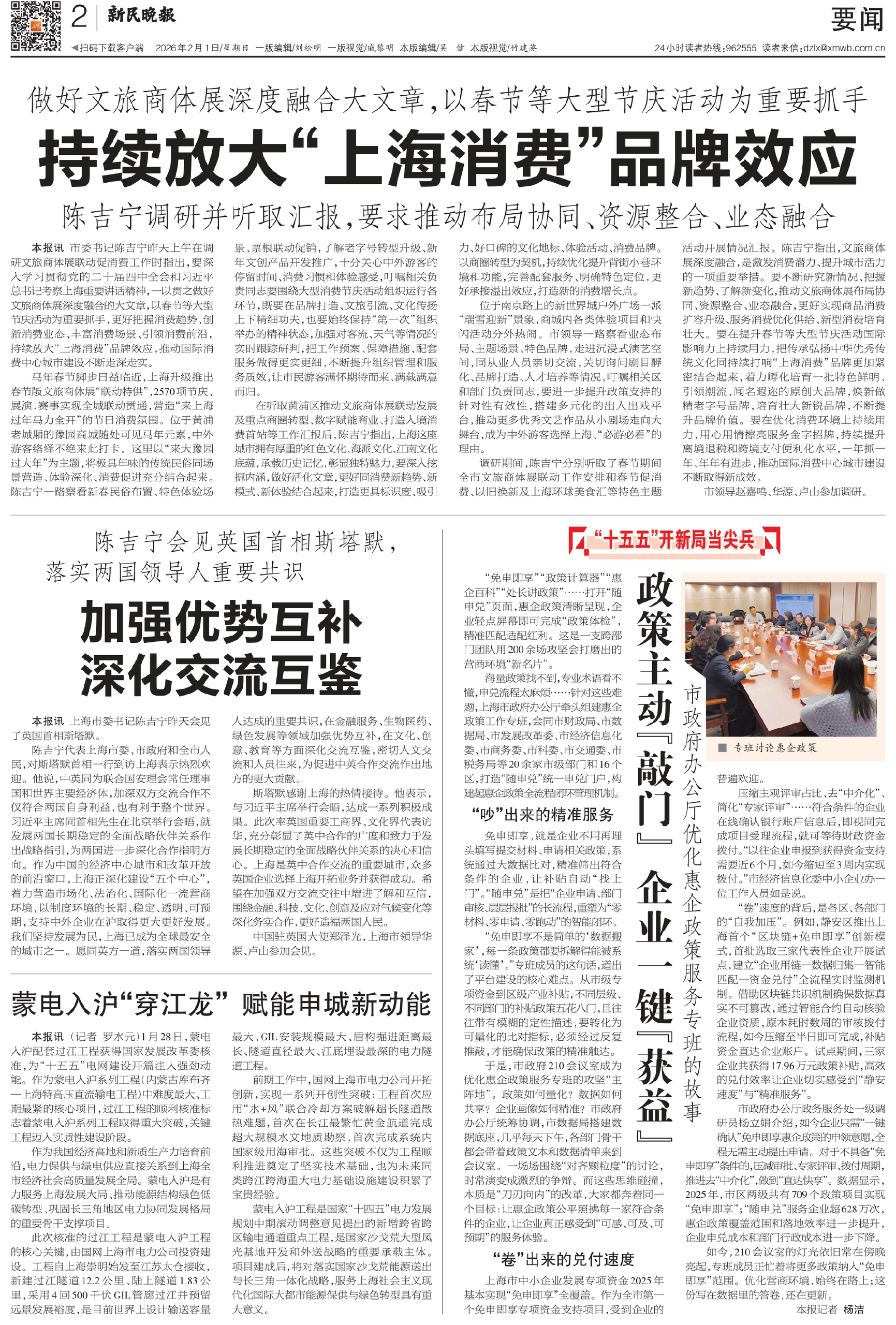 马年春节脚步日益临近,上海升级推出春节版文旅商体展“联动特供”,2570项节庆、展演、赛事实现全城联动贯通,营造“来上海过年马力全开”的节日消费氛围。位于黄浦老城厢的豫园商城随处可见马年元素,中外游客络绎不绝来此打卡。这里以“来大豫园过大年”为主题,将极具年味的传统民俗同场景营造、体验深化、消费促进充分结合起来。陈吉宁一路察看新春民俗布置、特色体验场景、票根联动促销,了解老字号转型升级、新年文创产品开发推广,十分关心中外游客的停留时间、消费习惯和体验感受,叮嘱相关负责同志要围绕大型消费节庆活动组织运行各环节,既要在品牌打造、文旅引流、文化传扬上下精细功夫,也要始终保持“第一次”组织举办的精神状态,加强对客流、天气等情况的实时跟踪研判,把工作预案、保障措施、配套服务做得更实更细,不断提升组织管理和服务质效,让市民游客满怀期待而来、满载满意而归。