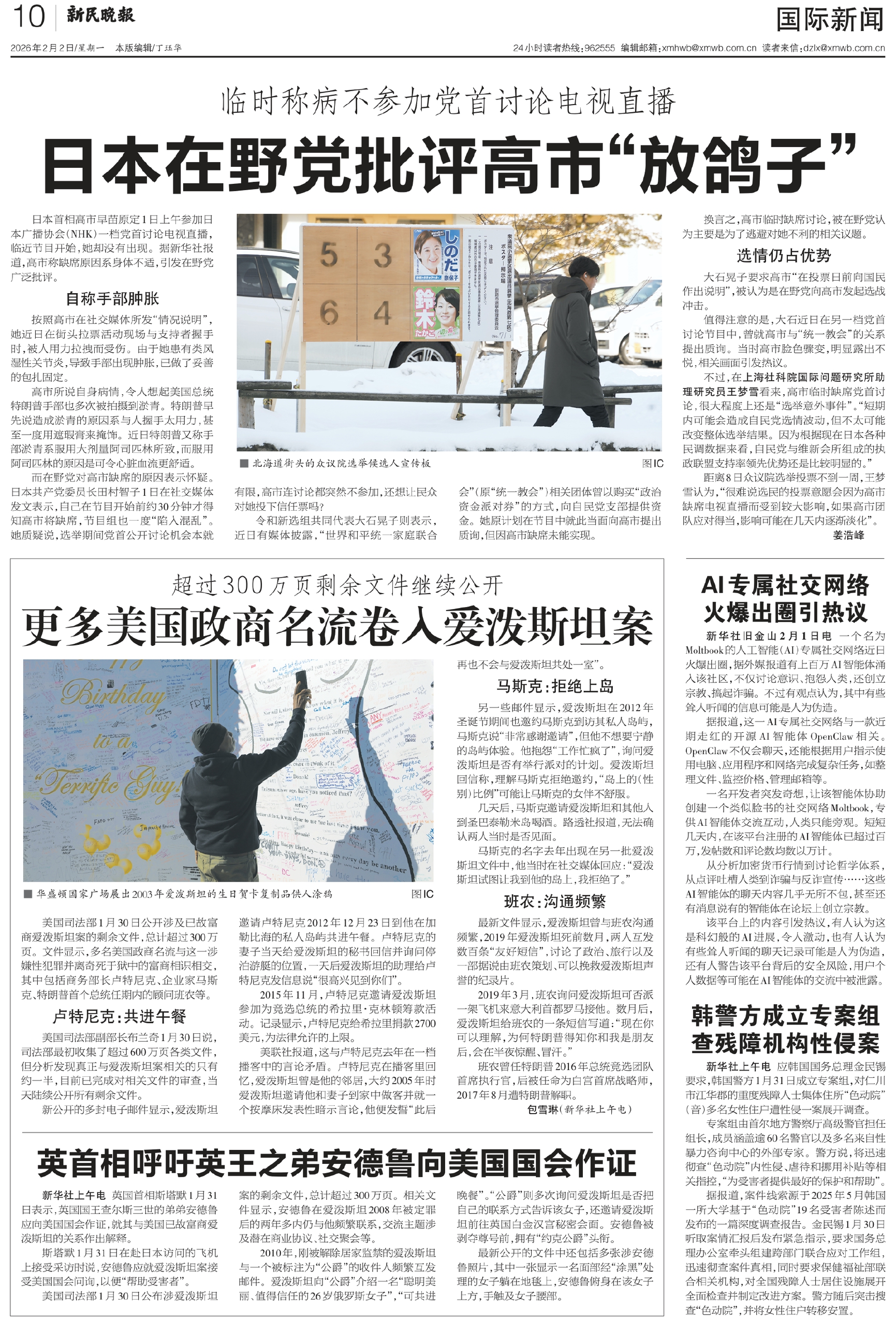 日本首相高市早苗原定1日上午参加日本广播协会(NHK)一档党首讨论电视直播,临近节目开始,她却没有出现。据新华社报道,高市称缺席原因系身体不适,引发在野党广泛批评。