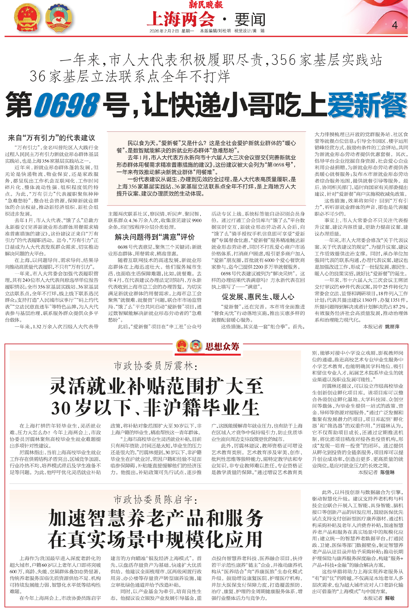 去年1月,市人大代表方永新向市十六届人大三次会议提交《完善新就业形态群体用餐需求精准普惠措施的建议》,这份建议被大会列为“第0698号”,一年来有效推动解决新就业群体“用餐难”。