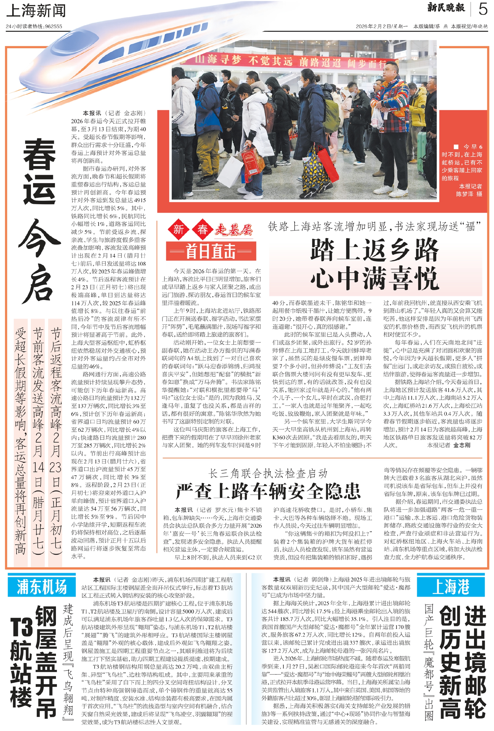 本报讯(记者 金志刚)2026年春运今天正式拉开帷幕,至3月13日结束,为期40天。受超长春节假期等影响,群众出行需求十分旺盛,今年春运上海预计对外客运总量将再创新高。