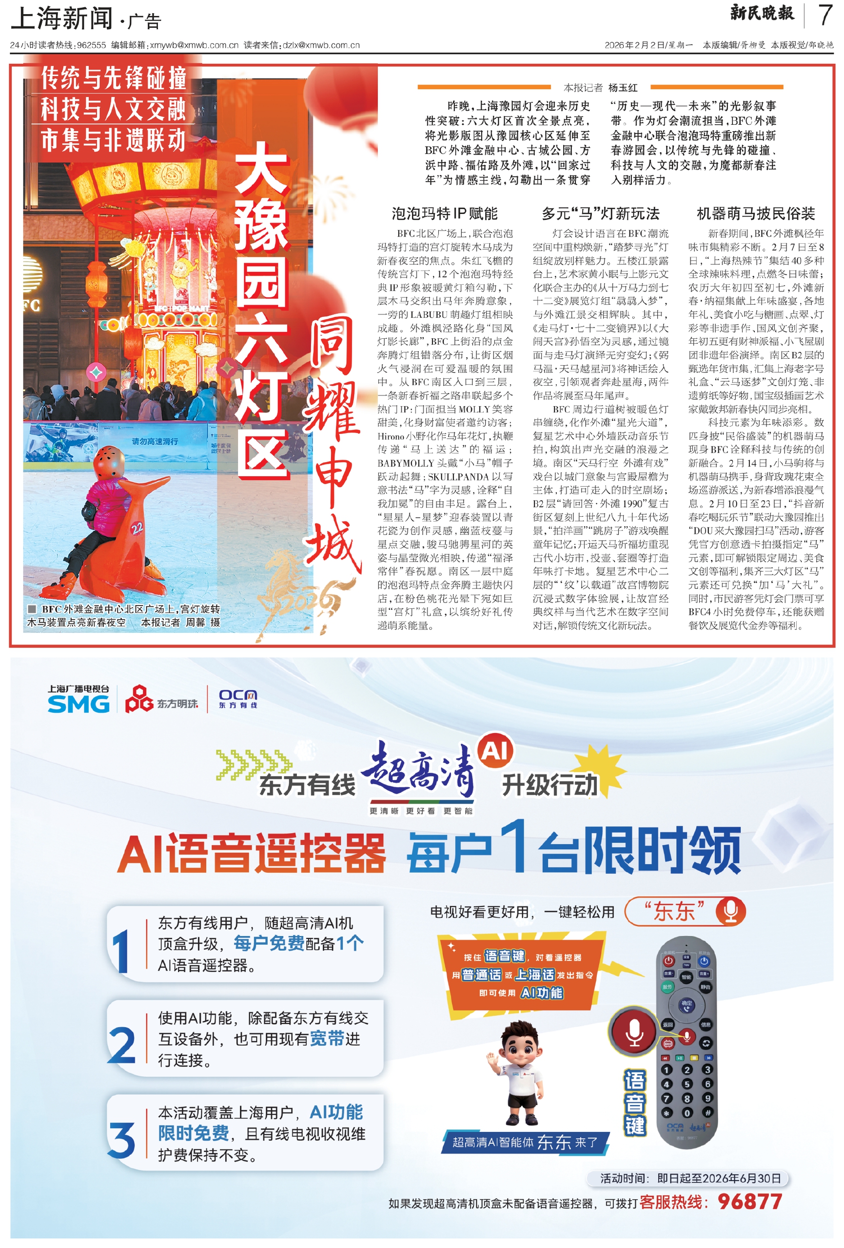 科技元素为年味添彩。数匹身披“民俗盛装”的机器萌马现身BFC诠释科技与传统的创新融合。2月14日,小马驹将与机器萌马携手,身背玫瑰花束全场巡游派送,为新春增添浪漫气息。2月10日至23日,“抖音新春吃喝玩乐节”联动大豫园推出“DOU来大豫园扫马”活动,游客凭官方创意透卡拍摄指定“马”元素,即可解锁限定周边、美食文创等福利,集齐三大灯区“马”元素还可兑换“加‘马’大礼”。同时,市民游客凭灯会门票可享BFC4小时免费停车,还能获赠餐饮及展览代金券等福利。