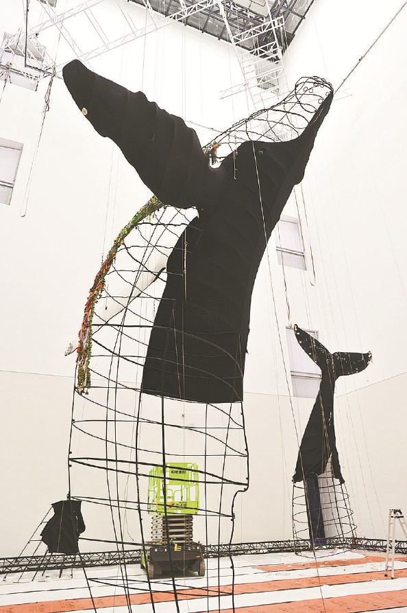 “鲸鱼的致敬”正在布展中 本文图片 记者 王凯 摄