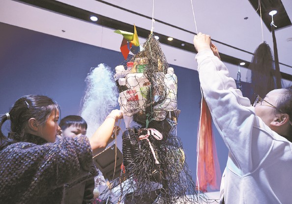 昨天,在B1展厅中,卡罗莱娜·凯塞多与来自上海多所学校的学生共同完成装置作品“幽灵网”的现场创作(见上图),他们通过剪裁、缠绕、打结与连接,将渔网与拾得的材料一同固定、组合,逐渐形成数件体量各异的雕塑作品。该作品是“鲸鱼的致敬”的衍生装置。艺术家与学生围绕材料来源、海洋现状及个人行动展开持续交流,使B1展厅成为一个“正在发生”的艺术现场。