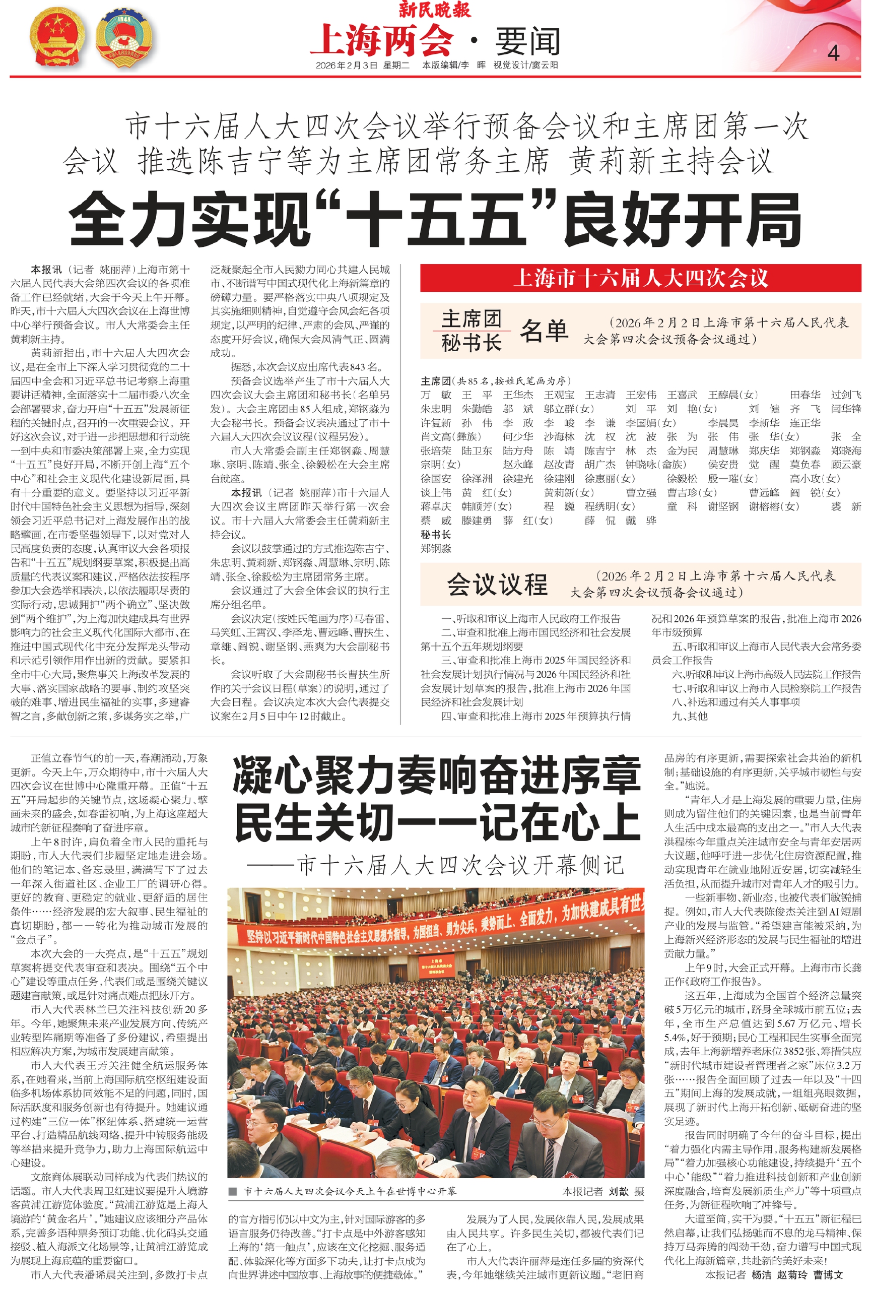 黄莉新指出,市十六届人大四次会议,是在全市上下深入学习贯彻党的二十届四中全会和习近平总书记考察上海重要讲话精神,全面落实十二届市委八次全会部署要求,奋力开启“十五五”发展新征程的关键时点,召开的一次重要会议。开好这次会议,对于进一步把思想和行动统一到中央和市委决策部署上来,全力实现“十五五”良好开局,不断开创上海“五个中心”和社会主义现代化建设新局面,具有十分重要的意义。要坚持以习近平新时代中国特色社会主义思想为指导,深刻领会习近平总书记对上海发展作出的战略擘画,在市委坚强领导下,以对党对人民高度负责的态度,认真审议大会各项报告和“十五五”规划纲要草案,积极提出高质量的代表议案和建议,严格依法按程序参加大会选举和表决,以依法履职尽责的实际行动,忠诚拥护“两个确立”、坚决做到“两个维护”,为上海加快建成具有世界影响力的社会主义现代化国际大都市、在推进中国式现代化中充分发挥龙头带动和示范引领作用作出新的贡献。要紧扣全市中心大局,聚焦事关上海改革发展的大事、落实国家战略的要事、制约攻坚突破的难事、增进民生福祉的实事,多建睿智之言,多献创新之策,多谋务实之举,广泛凝聚起全市人民勠力同心共建人民城市、不断谱写中国式现代化上海新篇章的磅礴力量。要严格落实中央八项规定及其实施细则精神,自觉遵守会风会纪各项规定,以严明的纪律、严肃的会风、严谨的态度开好会议,确保大会风清气正、圆满成功。