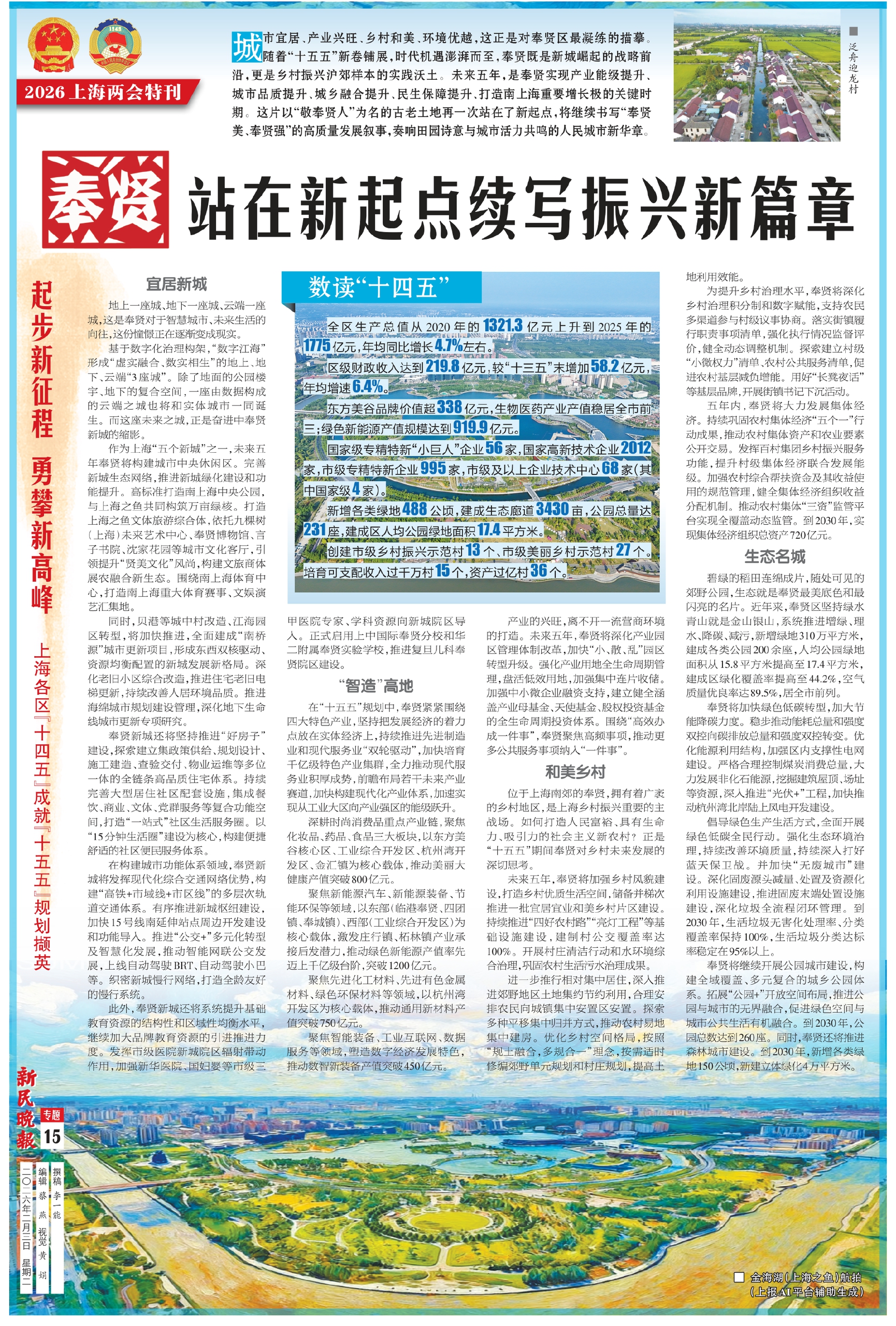 城市宜居、产业兴旺、乡村和美、环境优越,这正是对奉贤区最凝练的描摹。随着“十五五”新卷铺展,时代机遇澎湃而至,奉贤既是新城崛起的战略前沿,更是乡村振兴沪郊样本的实践沃土。未来五年,是奉贤实现产业能级提升、城市品质提升、城乡融合提升、民生保障提升、打造南上海重要增长极的关键时期。这片以“敬奉贤人”为名的古老土地再一次站在了新起点,将继续书写“奉贤美、奉贤强”的高质量发展叙事,奏响田园诗意与城市活力共鸣的人民城市新华章。