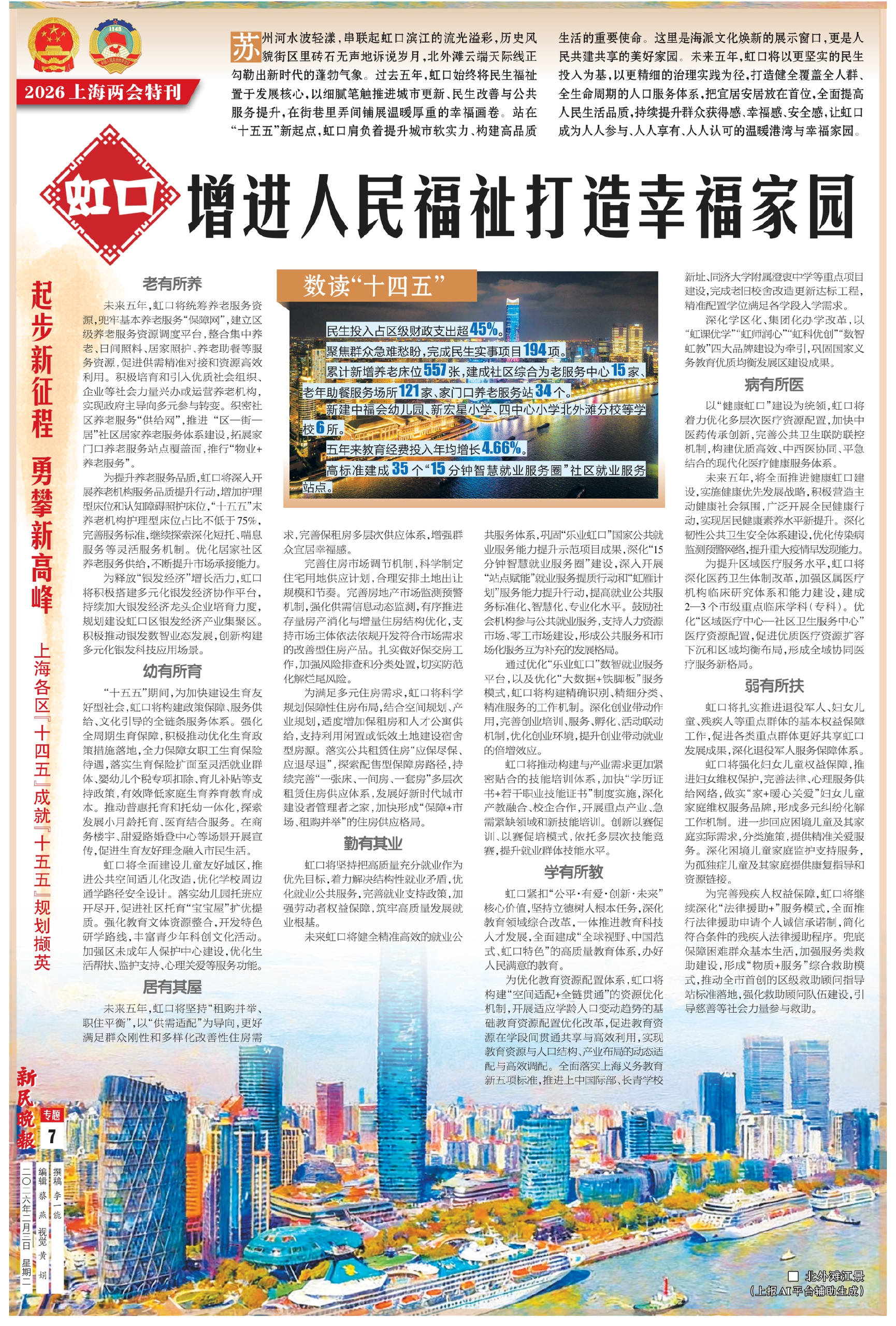 苏州河水波轻漾,串联起虹口滨江的流光溢彩,历史风貌街区里砖石无声地诉说岁月,北外滩云端天际线正勾勒出新时代的蓬勃气象。过去五年,虹口始终将民生福祉置于发展核心,以细腻笔触推进城市更新、民生改善与公共服务提升,在街巷里弄间铺展温暖厚重的幸福画卷。站在“十五五”新起点,虹口肩负着提升城市软实力、构建高品质生活的重要使命。这里是海派文化焕新的展示窗口,更是人民共建共享的美好家园。未来五年,虹口将以更坚实的民生投入为基,以更精细的治理实践为径,打造健全覆盖全人群、全生命周期的人口服务体系,把宜居安居放在首位,全面提高人民生活品质,持续提升群众获得感、幸福感、安全感,让虹口成为人人参与、人人享有、人人认可的温暖港湾与幸福家园。