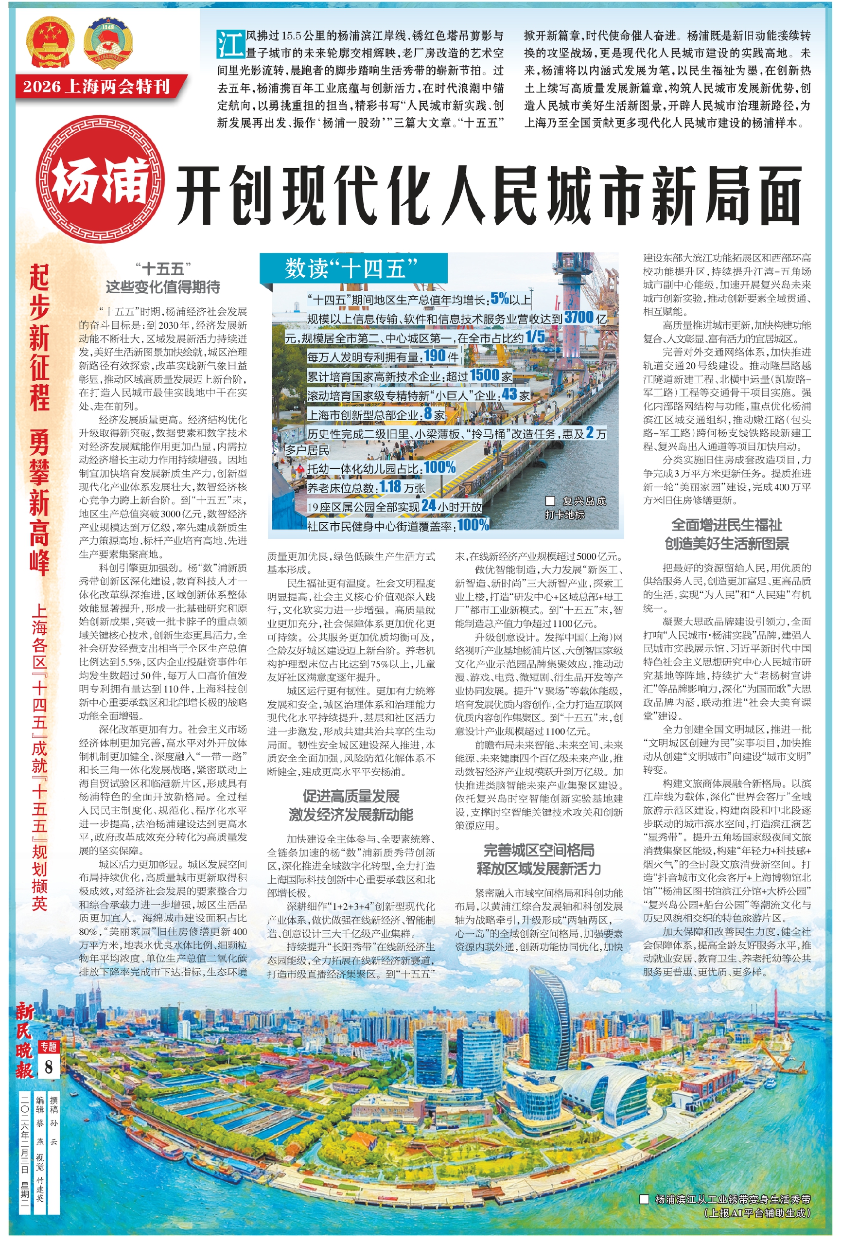江风拂过15.5公里的杨浦滨江岸线,锈红色塔吊剪影与量子城市的未来轮廓交相辉映,老厂房改造的艺术空间里光影流转,晨跑者的脚步踏响生活秀带的崭新节拍。过去五年,杨浦携百年工业底蕴与创新活力,在时代浪潮中锚定航向,以勇挑重担的担当,精彩书写“人民城市新实践、创新发展再出发、振作‘杨浦一股劲’”三篇大文章。“十五五”掀开新篇章,时代使命催人奋进。杨浦既是新旧动能接续转换的攻坚战场,更是现代化人民城市建设的实践高地。未来,杨浦将以内涵式发展为笔,以民生福祉为墨,在创新热土上续写高质量发展新篇章,构筑人民城市发展新优势,创造人民城市美好生活新图景,开辟人民城市治理新路径,为上海乃至全国贡献更多现代化人民城市建设的杨浦样本。