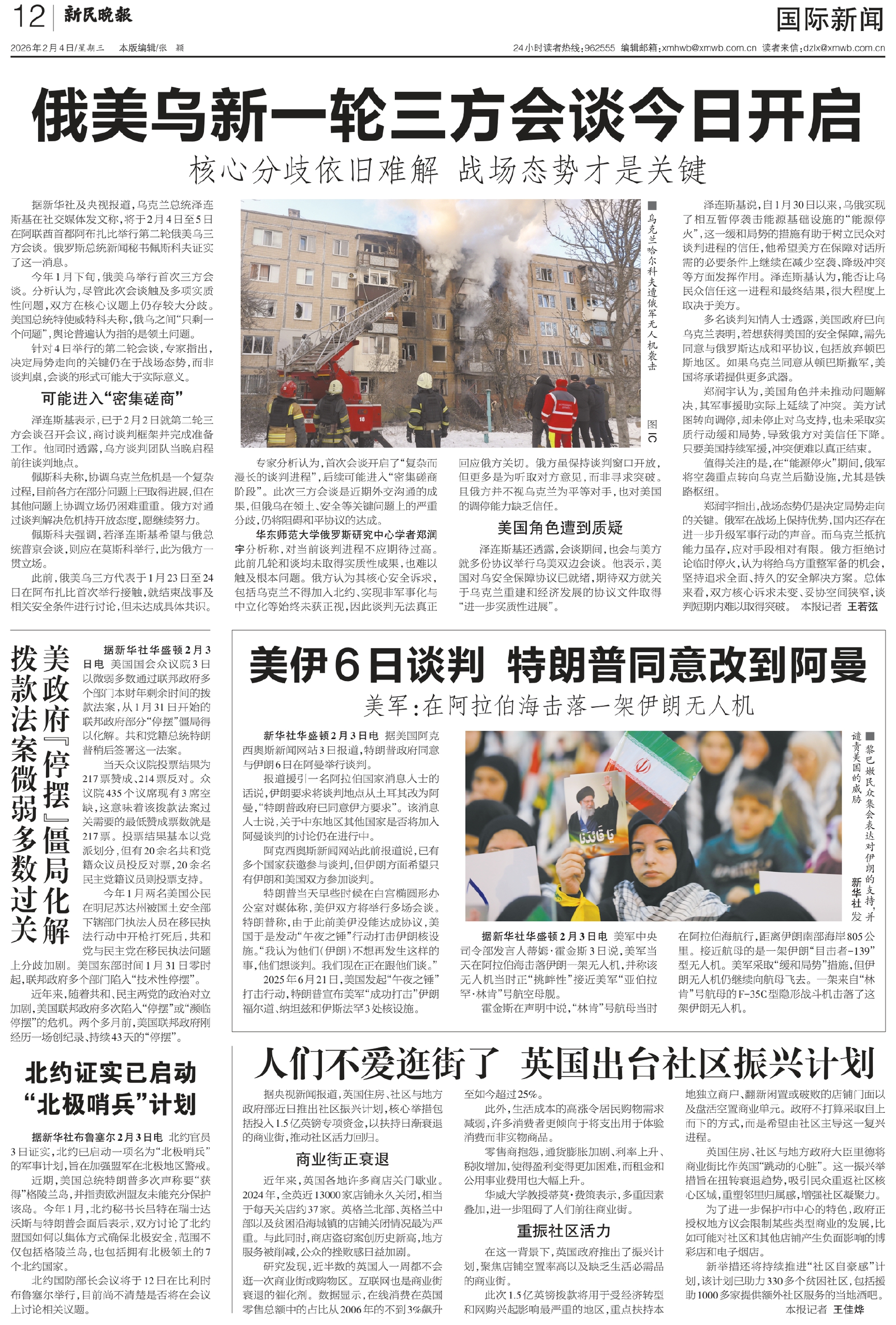 据新华社及央视报道,乌克兰总统泽连斯基在社交媒体发文称,将于2月4日至5日在阿联酋首都阿布扎比举行第二轮俄美乌三方会谈。俄罗斯总统新闻秘书佩斯科夫证实了这一消息。